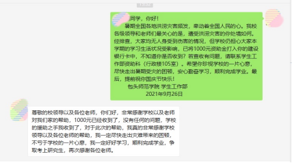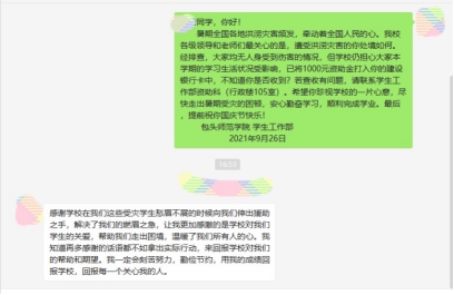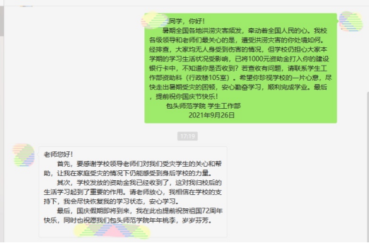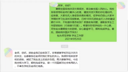 今年暑期,郑州、呼伦贝尔莫力达瓦旗等地遭受洪涝灾害,学校领导高度关注我校学生家庭受灾情况,随即向各学院下发了《包头师范学院关于启动受洪灾学生临时困难补助工作的通知》,开展受灾学生摸排,同时在包师学生工作微信公众号中发出“受灾同学:包师院等你平安归来!”的推送消息,鼓励受灾家庭学生振作精神。