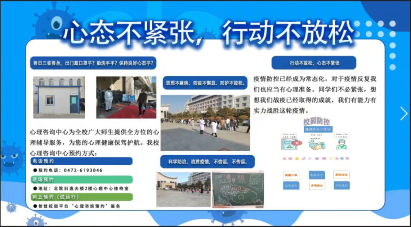 心理咨询中心针对本轮疫情果断采取行动,加大心理健康教育工作力度,多渠道多方位多角度做好学生心理疏导工作。线上线下全天心理咨询援助全线开通;推文“心态不紧张,行动不放松”宣传心理健康知识、提供心理防护指导;针对隔离学生进行电话心理咨询给予温暖帮助;组织系列箱庭游戏体验开展团体辅导;组织全校开展“心理微讲坛”主题班会。并制作展板宣传心理咨询途径和疫情防控相关内容。