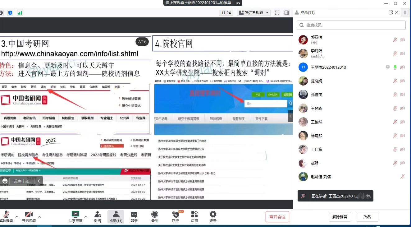 王丽杰、李丹阳、王彦媛3位同学分别从调剂的流程方法及专业课、公共课的面试特点出发,围绕“调剂信息来源,面试流程解析”,总结出丰富的调剂策略及面试技巧,如针对调剂有“规避信息差,寻找信息源”的技巧;针对面试备考,有“实战练习法,框架图总结”的诀窍。考研复试发生了极大的变化,部分同学对未知情况出现焦虑心理,针对这一情况,3位同学也纷纷支招,建议备考同学采用实战演练、适度放松等方式加强练习、调整心态,让2023届考研同学收获颇多。