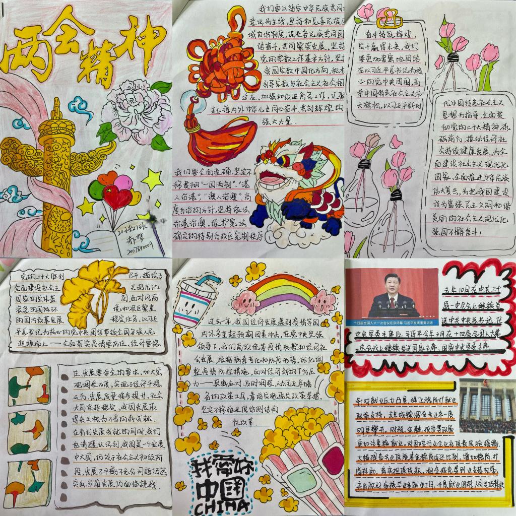本次活动要求同学们连续五日学习“两会”精神,并以手账的形式记录祖国的成就与期待,活动共征集到近百份作品。有的同学记录了过去一年和五年工作取得的成就;有的同学对“中国式现代化”、“全过程人民民主”、“高质量发展”、“平安中国”等“两会”热词进行了认真解读;还有的同学记录了2023年的工作展望和预期目标。手账图文并茂、布局合理,色彩丰富、契合主题,画出了对国家蓝图的畅想,同时反映了同学们对“两会”精神学习的认真态度,展现了同学们积极向上、爱党爱国的良好精神面貌。