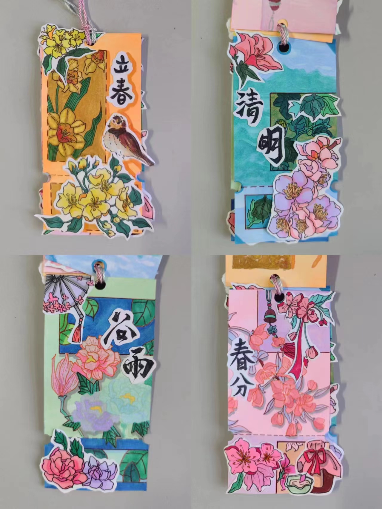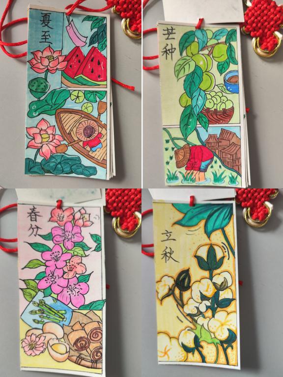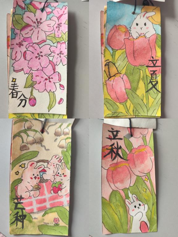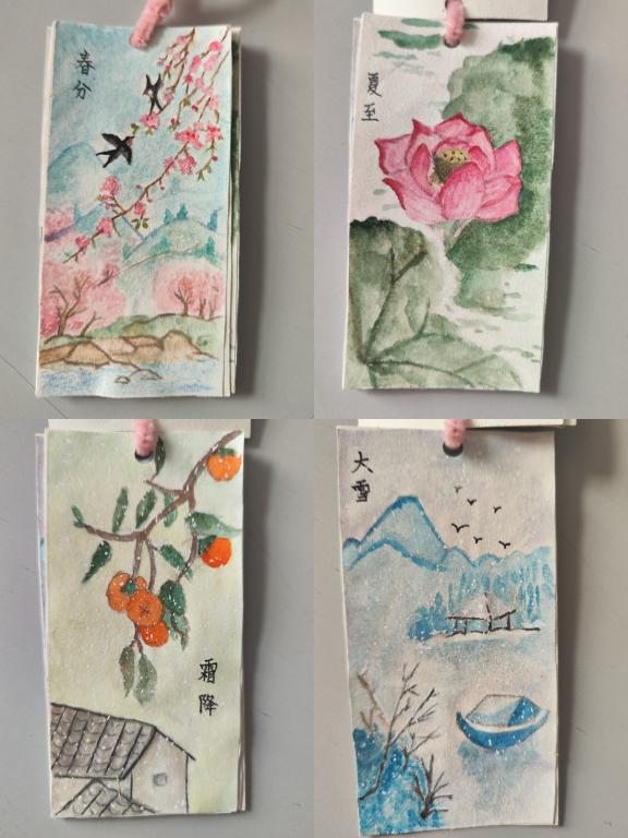 此次活动共收到60余份作品,每位同学以绘制4张书签为一组来展示二十四节气。作品设计新颖、精致美观,带有浓厚的传统文化气息。有的同学制作了带有桃花的书签;有的同学选择用带有过渡的绿色来画出清明时节雨纷纷的场景,一笔一画中尽显萧瑟;有的同学用娟秀的文字点缀在书签上,文字和书签上的大雁呼应,别有一番风味;有的同学用水彩颜料,画出惊蛰节气的昆虫形态;还有的同学在书签画出刚长出芽的麦穗和稻草人。