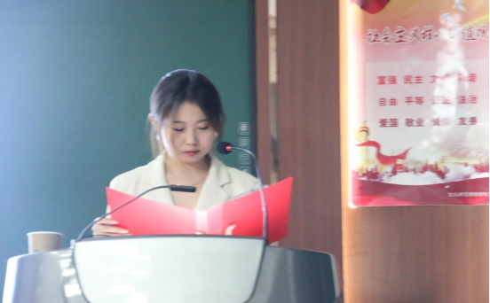 学生志愿者代表孙丹发言,表达了在疫情形势严峻时,数名学生志愿者在学院需要的时候挺身而出,吃苦耐劳,协助老师一直坚守到所有学生安全离校,为打赢疫情防控阻击战贡献力量,这是老师与学生志愿者共同努力的硕果。