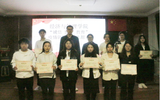 陈丽芳老师、曹瑞老师向田佳鑫、孙丹等十多名优秀学生志愿者代表颁发荣誉证书并合影留念,赞扬他们不畏疫情,勇于担当,踊跃参与到学院防疫服务工作,为疫情防控贡献力量。