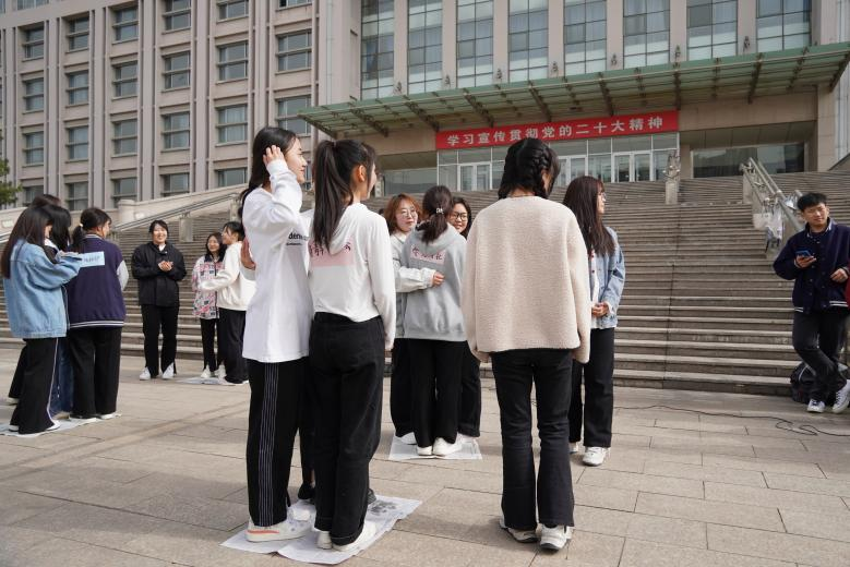 现场角逐十分紧张,同学们挑战在巴掌大的报纸上站三个人也成功了!芜湖!
