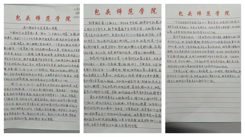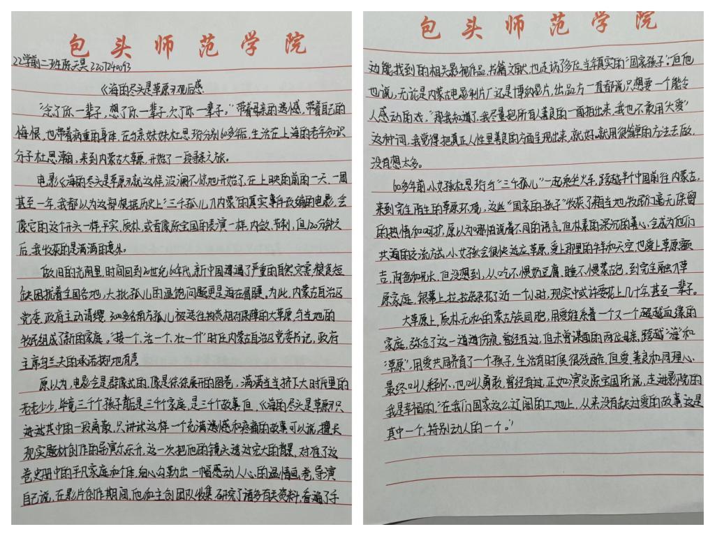 本次活动以观看《海的尽头是草原》并征集观影心得的形式展开,共有80余名同学参与活动。《海的尽头是草原》这部影片讲述了上世纪60年代,三千多名来自沪苏浙晥等地的幼小孤儿,从南方等地来到辽阔的大草原内蒙古,在蒙古族母亲的悉心照料下长大成人,演绎了一段超越地域、血缘、民族的人间佳话。观影后,学生们被草原人民无私的大爱和民族团结的强大精神力量所感染,有的同学被额吉们淳朴真挚的爱所打动,她们会把最好吃,最珍贵的东西留给孩子们;有的同学被那木汗在生死关头舍弃自己的生命救了毫无血缘关系的妹妹的大义而深受震撼;还有的同学表示,在奋力实现中华民族伟大复兴的征程上,只要各民族守望相助、紧密团结,就没有克服不了的困难,没有渡不过去的难关,要将铸牢中华民族共同体意识深植内心,自觉做民族团结进步事业的忠实践行者、推动者,为民族团结进步贡献自己的力量。