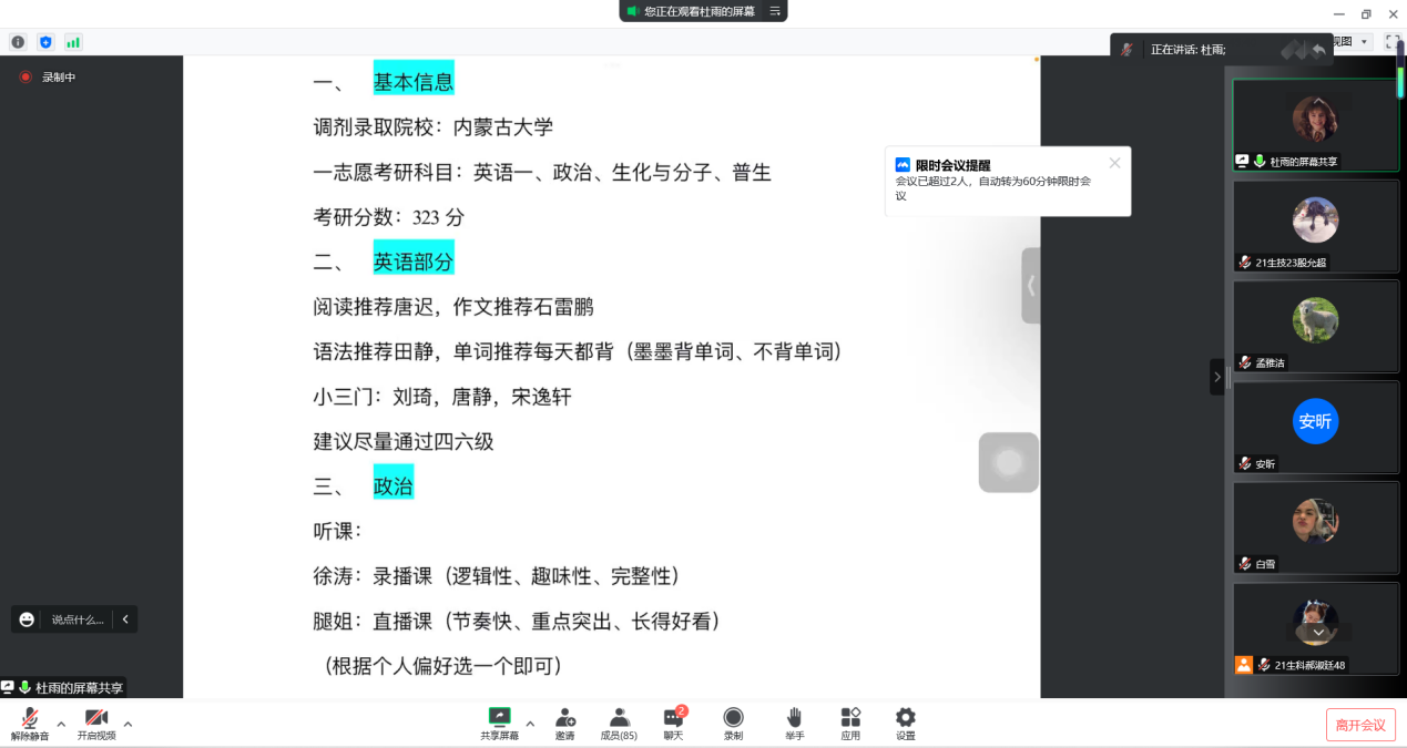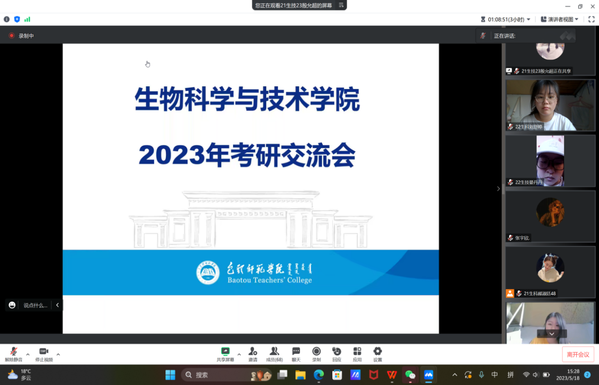 为培育优良学风,激发学习动力,增进同学们对考研知识了解,明确备考方向,更好地规划大学生活,生物科学与技术学院于5月18日下午2:30在腾讯会议举办2023年考研交流会,本次交流会邀请19级考研成功上岸的同学与大家分享自己的考研经验和心得。