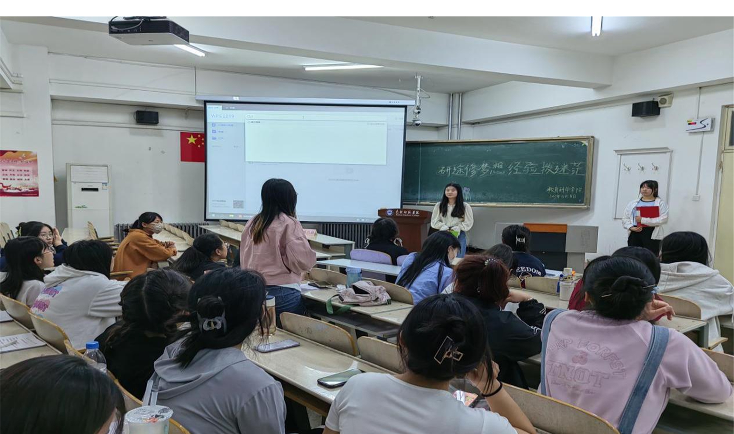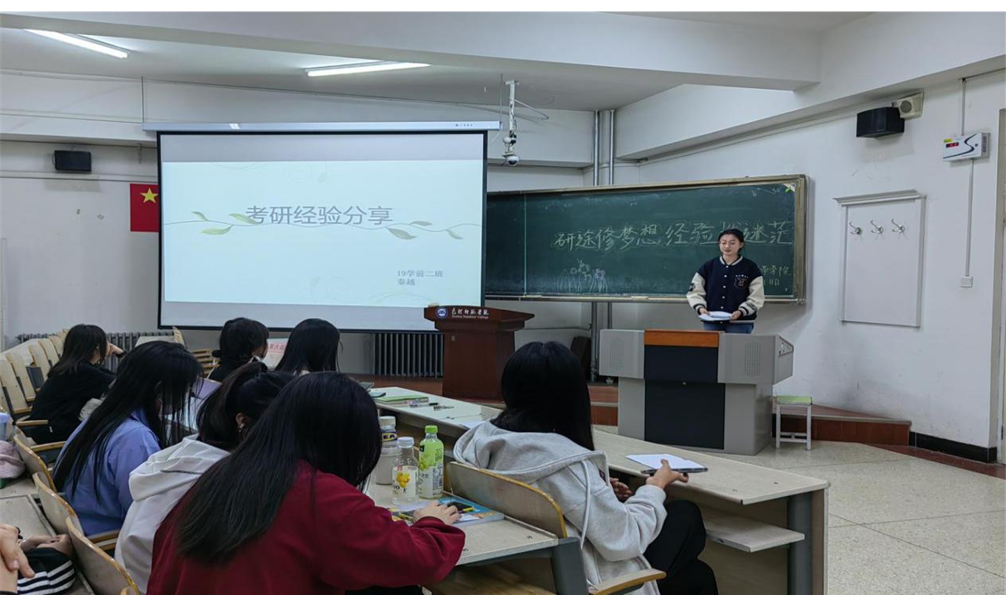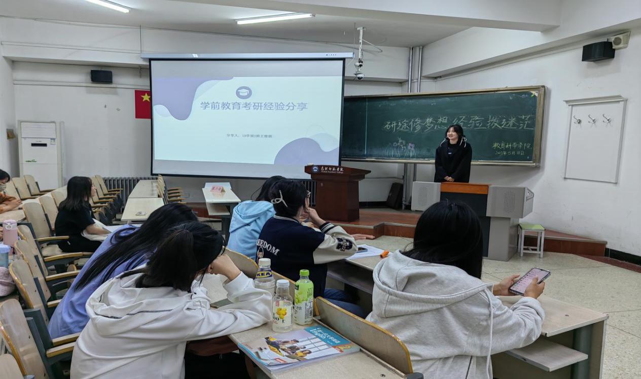 为深入开展学习贯彻习近平新时代中国特色社会主义思想主题教育,针对学生们普遍关注的考研问题,教育科学学院于5月11日晚上在博学楼西104教室举办学前教育专业考研经验交流分享会。此次分享会邀请了5名2019级考研成功的毕业生为2020级、2021级、2022级部分学生进行经验分享。