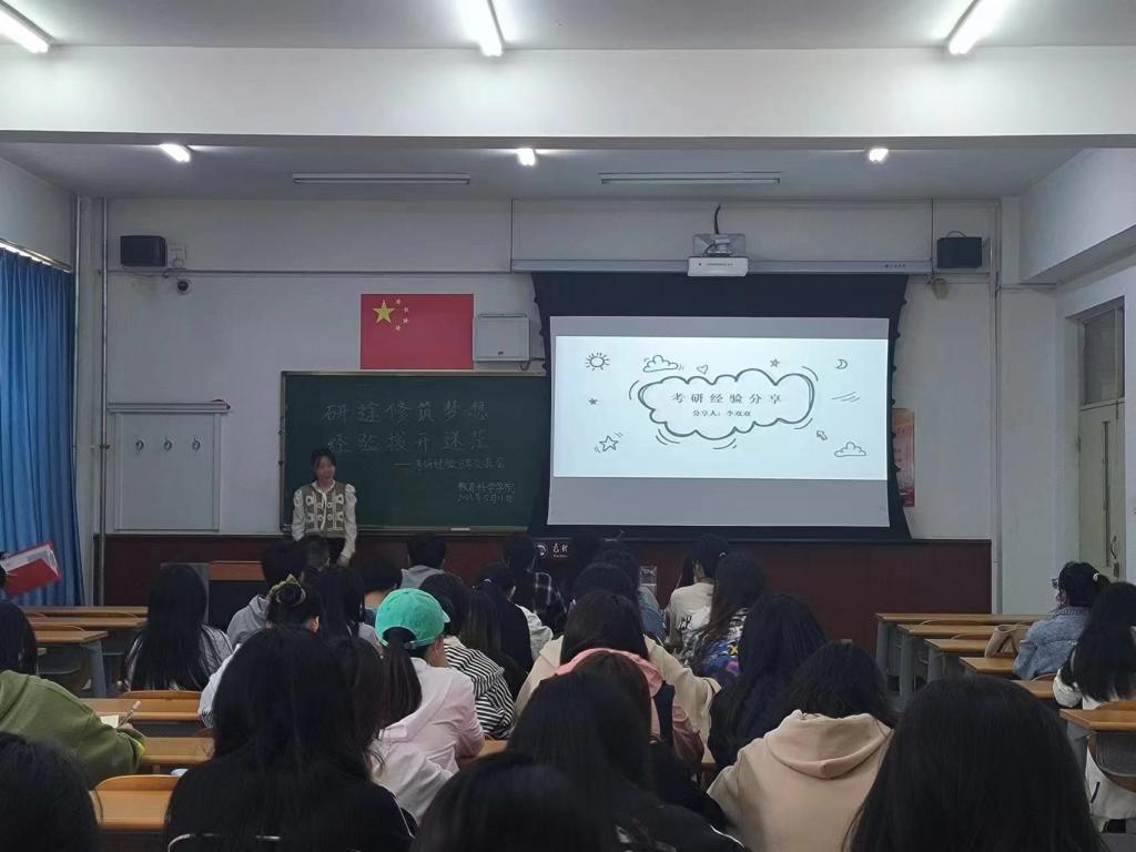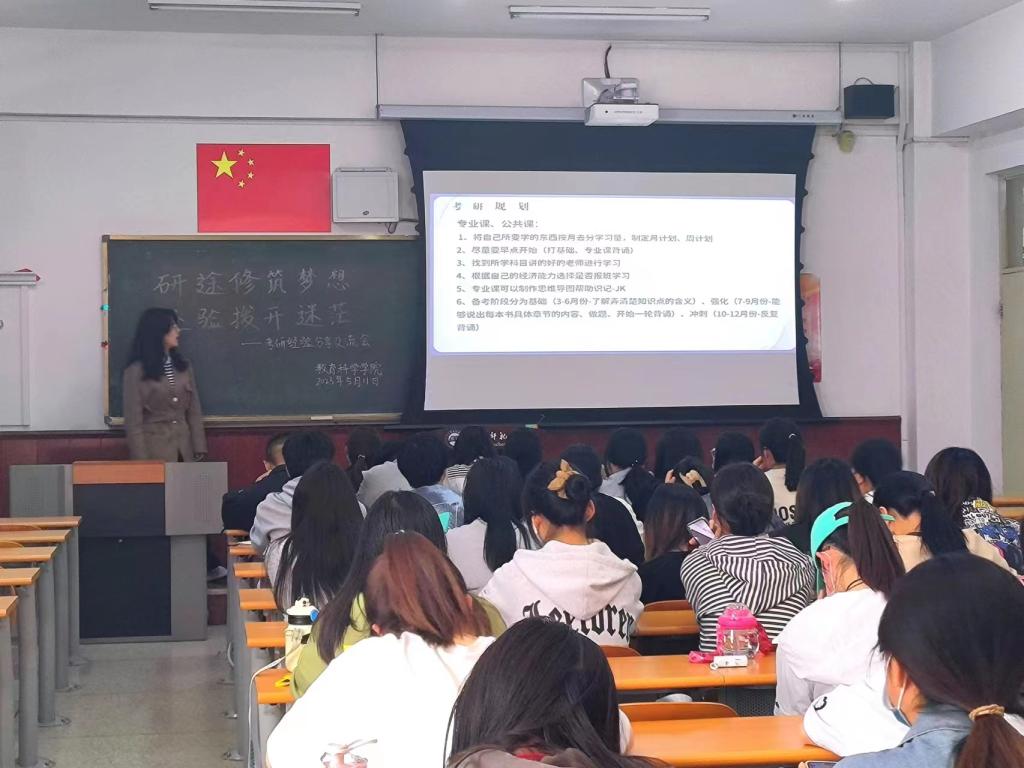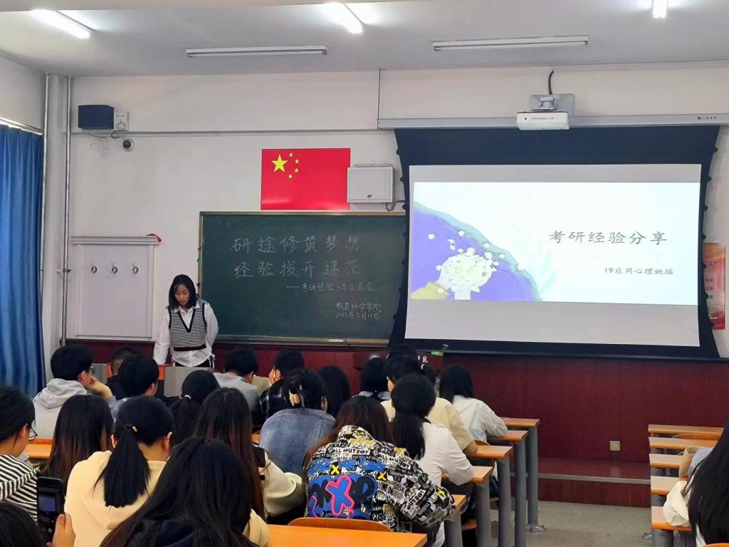 为深入开展学习贯彻习近平新时代中国特色社会主义思想主题教育,解答学生们普遍关注的考研问题,教育科学学院于5月11日下午,在博西102举办了应用心理学专业考研经验分享交流会。本次交流会邀请了3名2019级考研成功的同学分享经验,2020、2021、2022各年级同学都积极踊跃参加。