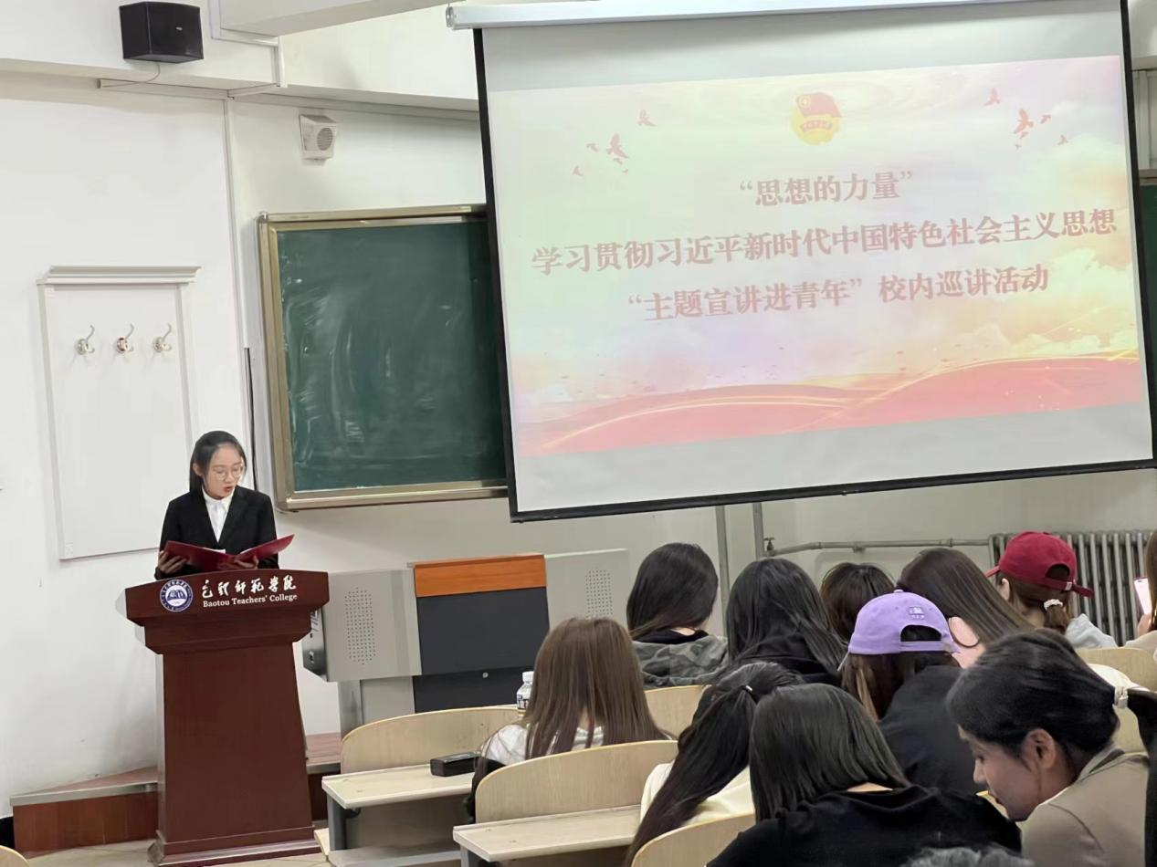 为深入开展学习贯彻习近平新时代中国特色社会主义思想主题教育,推动习近平新时代中国特色社会主义思想和党的二十大精神在广大团员青年中走深走实,努力在以学铸魂、以学增智、以学正风、以学促干方面取得实效,马克思主义学院在2023年5月22日开展了“思想的力量”学习贯彻习近平新时代中国特色社会主义思想“主题宣讲进青年”校内巡讲活动。活动邀请了大学生形势政策教育宣讲团宣讲员乔思宁、周静两位同学为全院学生进行宣讲。