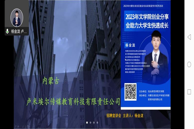 为深入贯彻落实党的二十大精神,进一步落实共青团促进大学生就业行动,实施大学生就业引航计划,引导学生立足实际、找准定位,树立理性、平实的择业观、就业观,提升学生就业能力以及就业创业积极性。5月26日下午,由文学院团总支主办的2023年创业分享会在线上腾讯会议顺利举办。本次分享会特邀文学院优秀学子、内蒙古卢米埃尔传媒教育科技创始人杨金泷主讲,会议由文学院学工办负责人贺芬老师主持,我院各年级各专业同学积极参与。