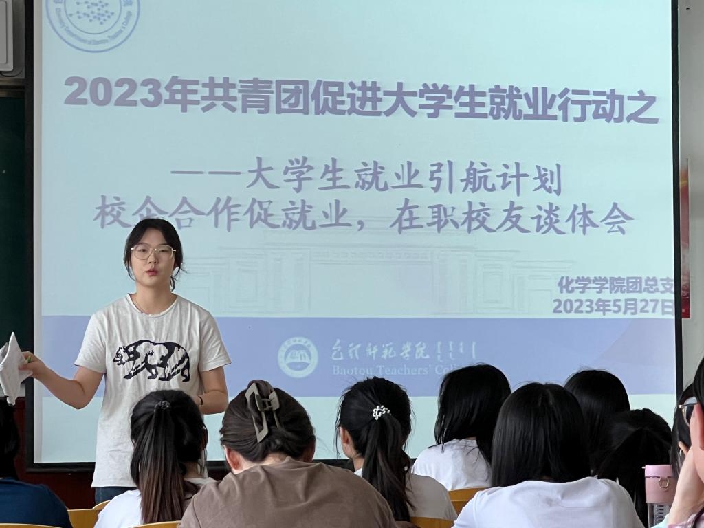 本次宣讲活动邀请到了化学学院2021届、2022届共三名优秀在职校友郭庆、姚新影、赵丽荣。他们分别分享了在内蒙古大全新能源有限公司、内蒙古美科新能源有限公司以及包头市青山区装备园区从事三支一扶岗位的工作体会;并分享了他们在校期间是如何求职、准备面试以及准备考试的经验。我院2020级学生积极参与,专心听讲学习,认真收获不一样的人生经验。