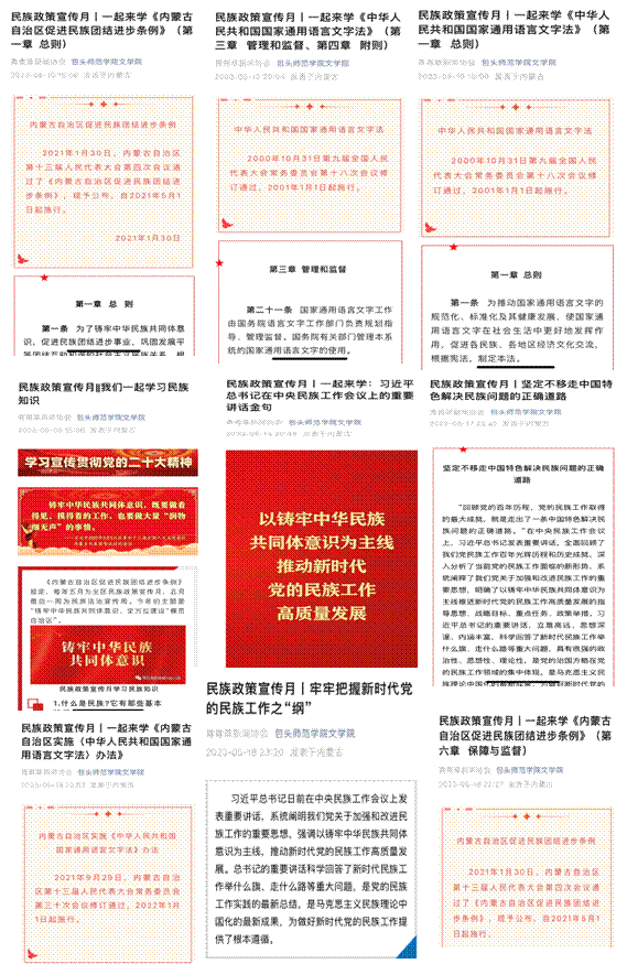为深入学习贯彻党的二十大精神,全面贯彻落实党中央、自治区党委和包头市委民族工作会议精神,加强党的民族理论政策和民族法律法规的宣传教育,按照学校安排部署,做深做细做实“民族政策宣传月”“民族法治宣传周”工作,文学院开展了一系列形式多样的民族政策宣传活动,更加有形有感有效铸牢中华民族共同体意识,教育引导广大青年更加由衷地感党恩、听党话、跟党走。