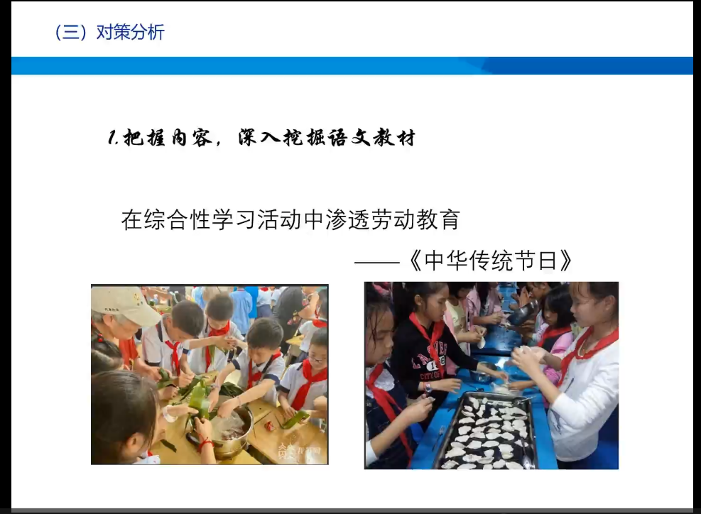 劳动教育是当前义务教育阶段热议的话题,也是基础教育阶段较难落实落地的项目。张涛同学抓住本学科领域前沿热点与大家进行了分享交流。她按照“为什么融””“融什么”“怎么融”的线索,以国家劳动教育相关政策为依托,以统编本小学语文教材内容为切入点,分析了劳动教育融入小学语文教学的路径。汇报结束后,同学们分别从劳动教育融入小学语文的目标、评价、方法等角度进行了提问和交流。