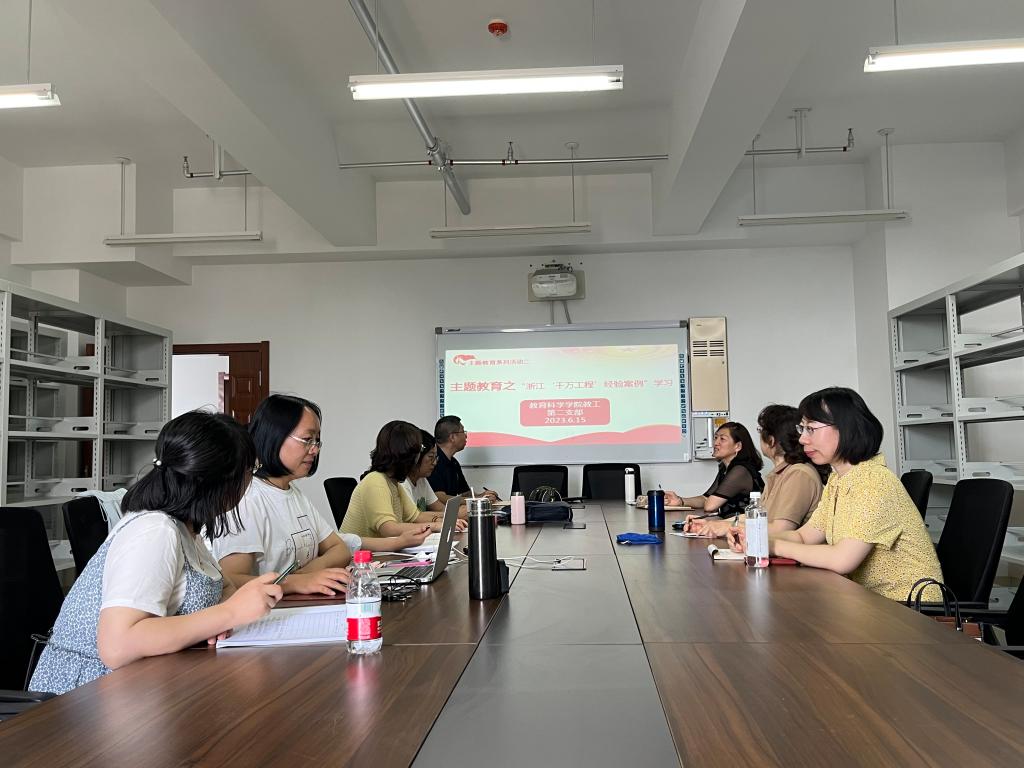 为深入学习贯彻习近平新时代中国特色社会主义思想主题教育,扎实推动主题学习走深走实,切实把学习成果转化为推动学院教育工作高质量发展的强大动力,2023年6月15日下午3时,教育科学学院教工第二党支部召开了“浙江‘千万工程’经验案例”主题学习会,会议由第二党支部书记张烨琳主持。