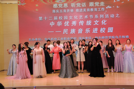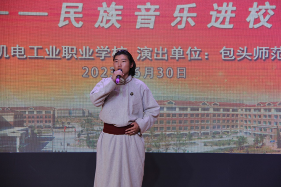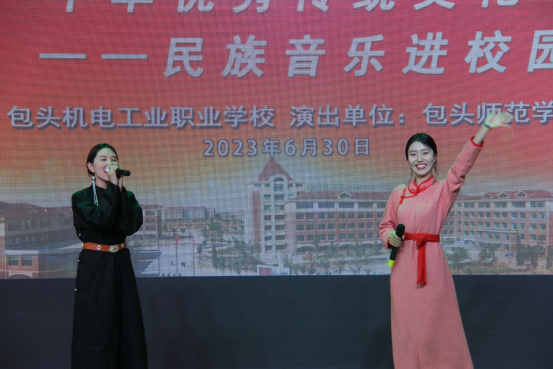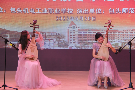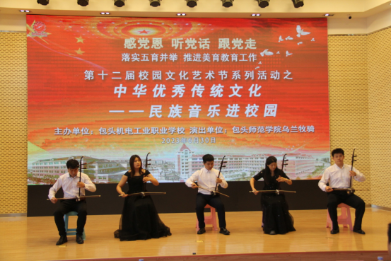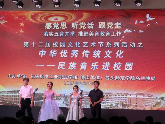 在学习贯彻习近平新时代中国特色社会主义思想主题教育和喜迎中国共产党成立102周年之际,包头师范学院音乐学院组织乌兰牧骑演出队于2023年6月30日下午15:00,赴包头机电工业职业学校,开展“感党恩 听党话 跟党走”暨中华优秀传统文化民族音乐进校园活动,活动在包头机电工业职业学校会堂举行。