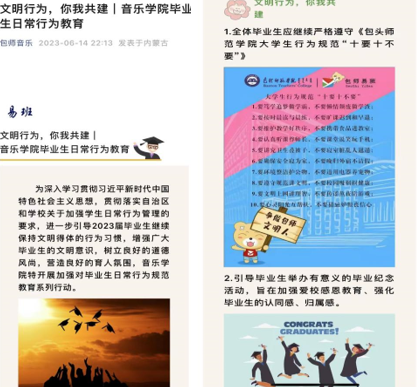 七是加强对毕业生日常行为规范教育。音乐学院以“文明校园,你我共建”为主题,在“包师音乐”推送《文明行为,你我共建|音乐学院毕业生日常行为教育》链接,利用易班平台宣传形式,引导2023届毕业生继续严格遵守《包头师范学院大学生行为规范“十要十不要”》,继续保持文明得体的行为习惯,进一步增强广大毕业生的文明意识,树立良好的道德风尚,营造良好的育人氛围。