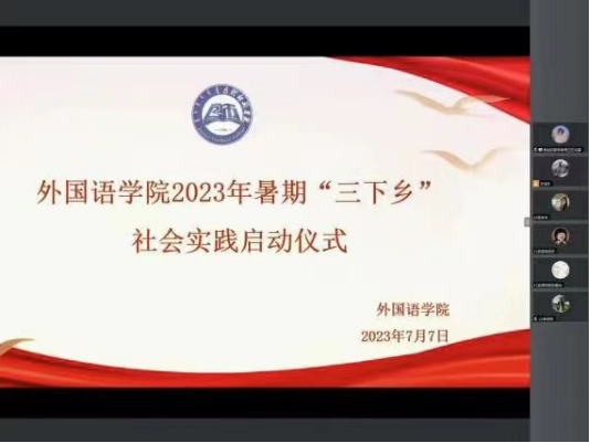 为深入学习贯彻习近平新时代中国特色社会主义思想主题教育,全面贯彻落实党的二十大精神,引导青年学生积极投身社会实践,发挥自身学科优势,增长才干、助力乡村振兴。7月7日,外国语学院采用线上线下相结合的方式召开2023年暑期“三下乡”社会实践启动仪式。外国语学院党总支副书记丁坤、团总支负责人门宇、辅导员王剑及社会实践团队成员代表参加了启动仪式。