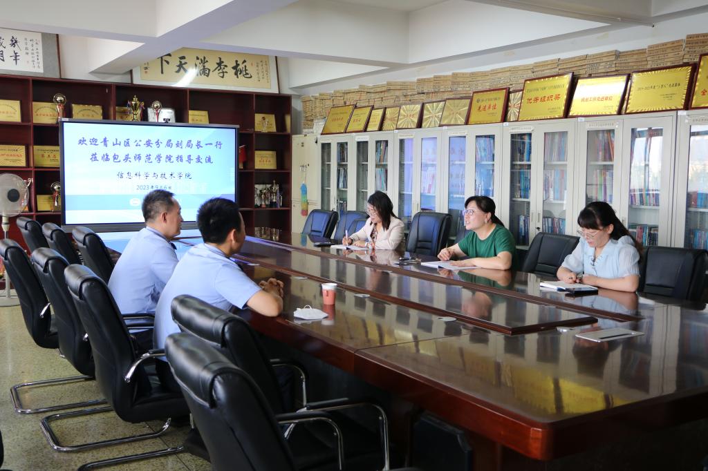 为加强校地合作,推进2024届毕业生实习、就业等工作,9月6日上午,信息学院在博学楼710会议室同青山区公安分局副局长刘燕强一行进行交流座谈,学院院长陈静、副院长尹淑娟、学工办负责人姜嘉丽参加。