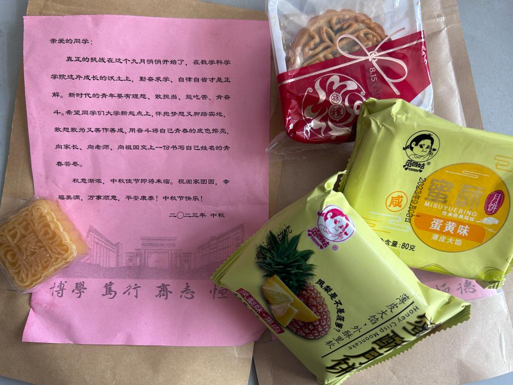 小小的节日问候,饱含了学院对学生们的殷切期望,让同学们在老师们的温暖陪伴中感受到关爱,也希望学生们强化对传统文化的认同,将中秋节的传统习俗、乡愁思念和家国情怀融为一体,在数学科学学院这片成长的沃土上勤奋求学,自律自省,奋发有为。(数学科学学院)