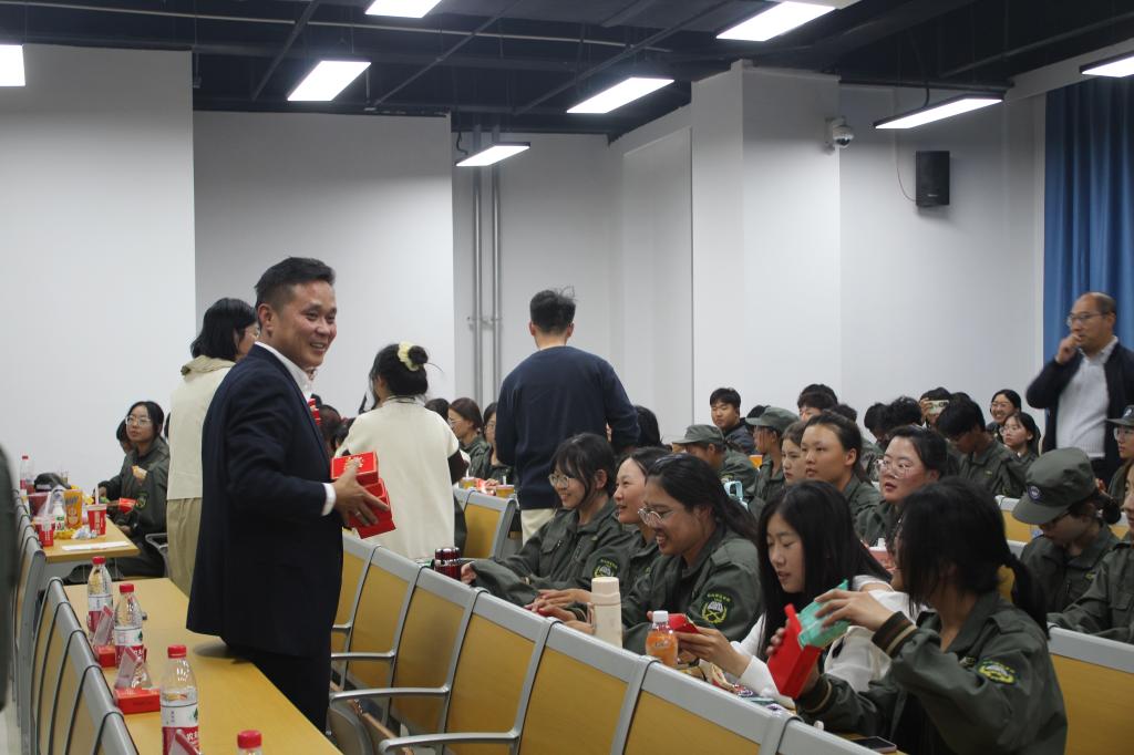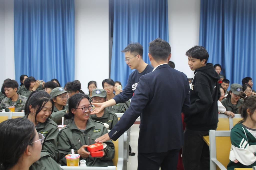 联欢会上,孙傲飚书记从大学生活规划、包头师范学院优秀校友、新校区搬迁等方面向新生们介绍了包头师范学院的发展历程,表达出对政法学子的殷切期望和建设包师高等教育新高地的坚定信心。郭宏升副书记表达了对全体教官的感谢,对全体新生在军训中的良好表现给予了鼓励和表扬,希望同学们在节后依然保持军训取得的成果,认真学习,积极参加各类比赛活动,为政法学院争光添彩。晚会在郭宏升副书记深情演唱的歌曲《等待》中拉开序幕。紧接着同学们的精彩表演蝉联不绝,博得了现场观众的热烈掌声,营造出了浓厚的节日氛围。孙傲飚书记和赵鹏然老师在喜气洋洋的节日氛围下深情献唱了《灰姑娘》、《成都》这两首经典曲目。晚会现场温情满满,气氛也在不知不觉中逐渐升温。为向同学们表达节日祝福与关怀,学院老师们还向全体新生发放了各色香甜的月饼。为提高同学们的参与热情,本次中秋晚会还设置了许多互动环节,如你划我猜、中秋百问、猜歌名、猜灯谜等,同学们积极参与其中,晚会现场一片欢声笑语。