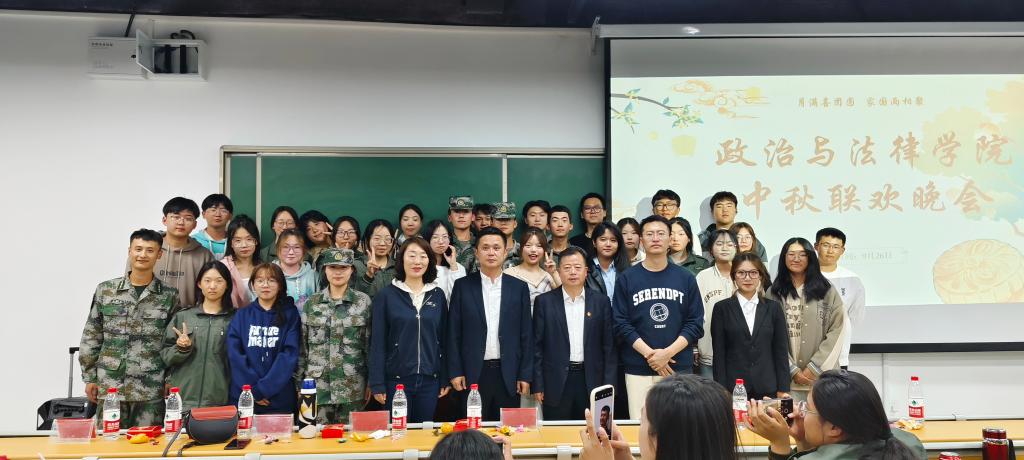 为弘扬中华民族传统文化,丰富校园文化生活,向同学们传递节日的祝福,9月27日晚上,政法学院在九原校区综合楼208教室举办了中秋迎新慰问、联欢晚会。学院党总支书记孙傲飚、副书记郭宏升、副院长魏成、学工办主任袁爱荣、辅导员兼班主任赵鹏然、班主任包娜、全体教官与大一新生们共聚一堂、欢度良宵。