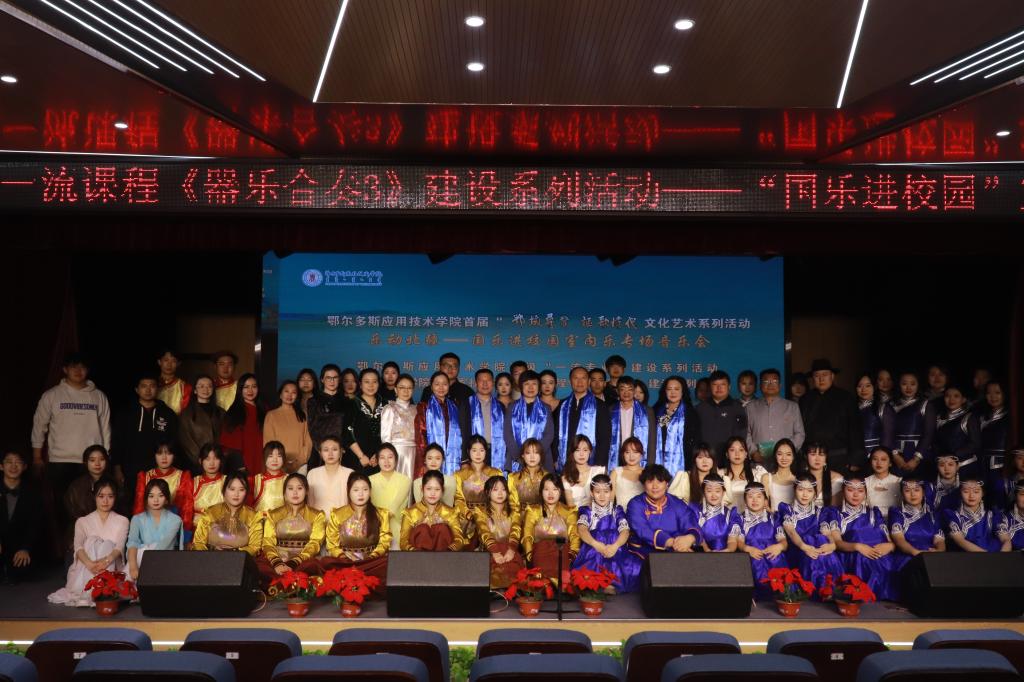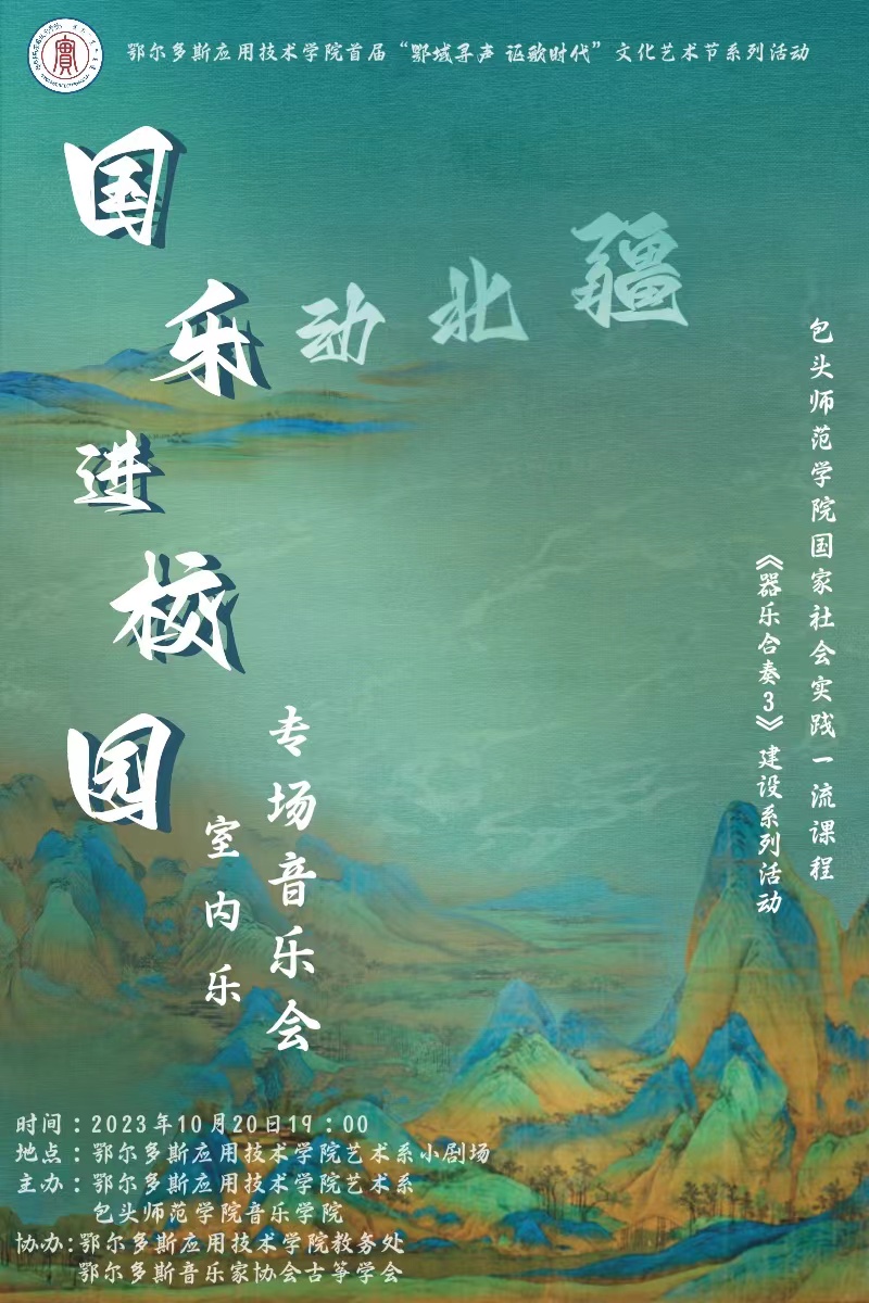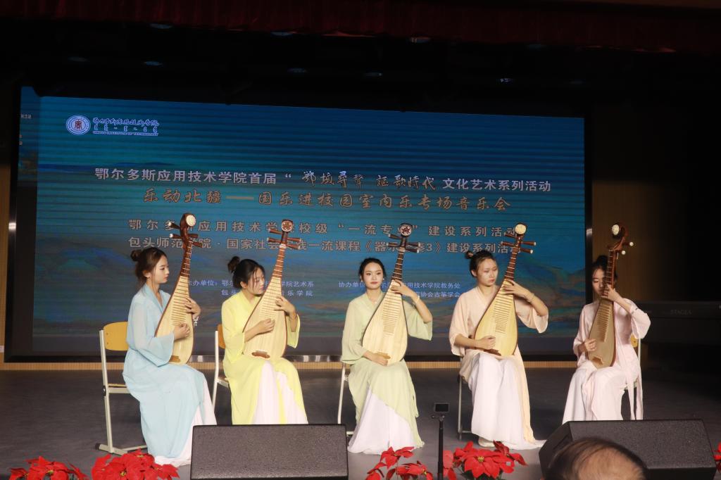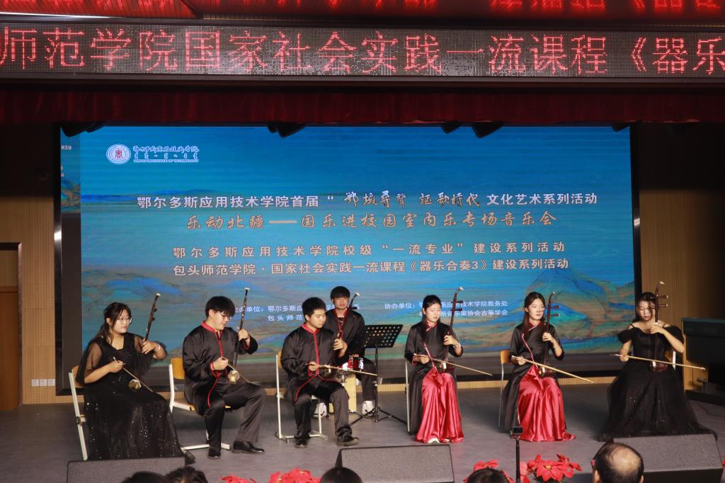 10月20日,应鄂尔多斯应用技术学院“鄂城寻声讴歌时代”文化艺术节邀请,音乐学院《器乐合奏3》(民乐)国家社会实践一流课程教学团队师生赴该校开展音乐专业艺术实践课程建设交流与“乐动北疆”民族室内乐专场音乐会。活动由器乐教研牵头,音乐学院贾晓光、苗燕、韩占坤、陈娟、刘小璐参加交流与音乐会活动。