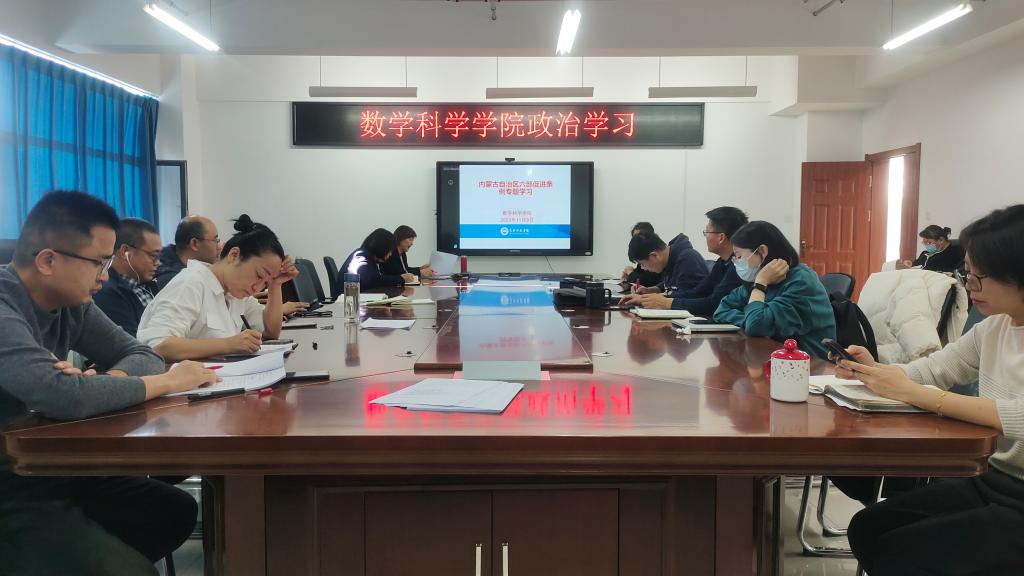 数学科学学院要求全体老师以习近平新时代中国特色社会主义思想为指导,牢牢把握党中央对内蒙古的战略定位,深刻理解六部促进条例的重大意义,结合数学学科专业,融合重点研究领域,提升学院实际的教学科研工作。(数学科学学院)