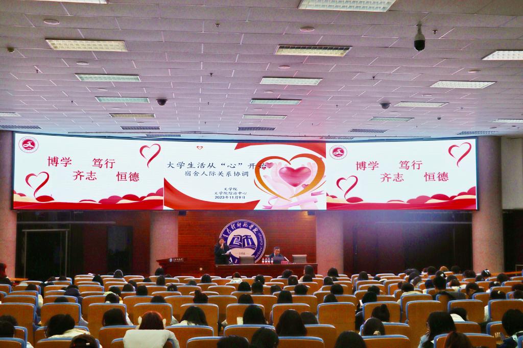 为落实学校“一站式”学生综合管理模式的要求,营造健康和谐的学生社区氛围,11月9日晚,文学院在学术报告厅举办宿舍人际关系心理健康讲座。本次讲座由教育科学学院刘运合副教授主讲,辅导员贺芬、白斯琴出席,我院2023级新生及文学院全体宿舍长参会。