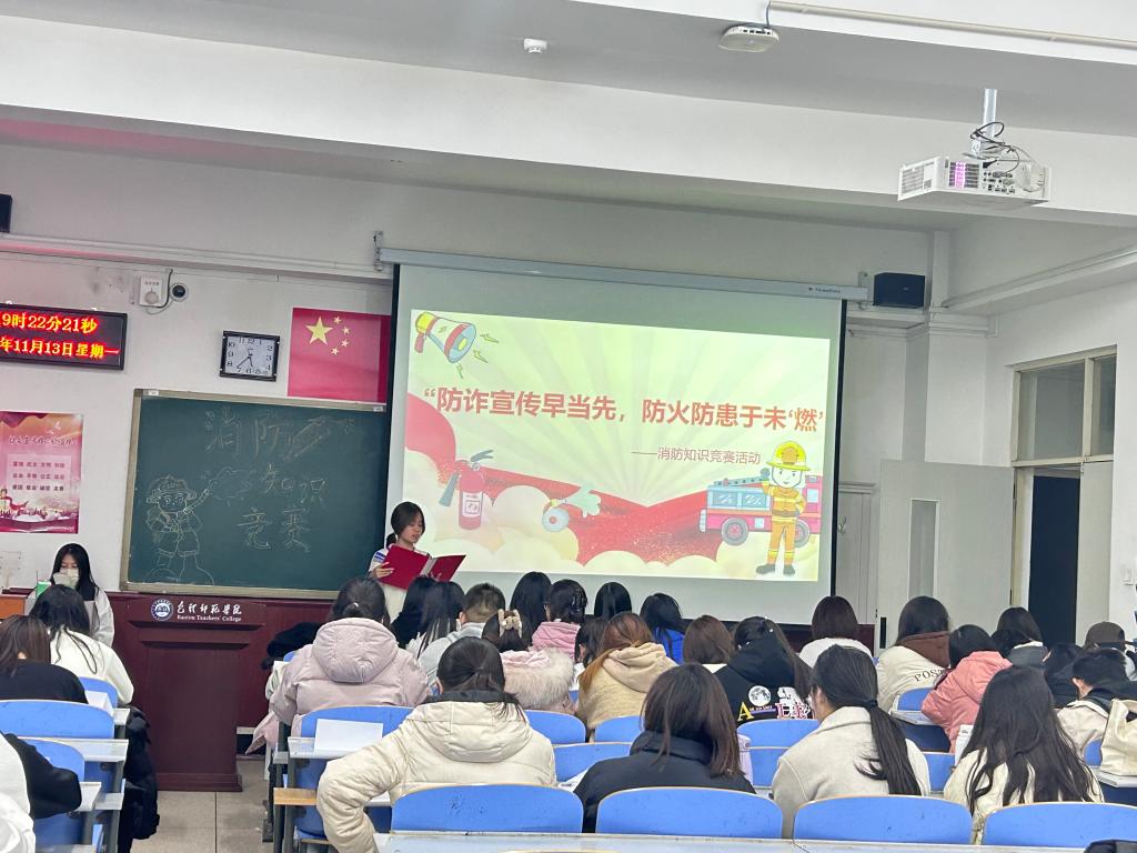 十一月是消防安全月,为提高同学们的消防安全意识与防范能力,我校教育科学学院于11月13日晚举办了“防火防患于未‘燃’,防诈宣讲早当先”知识竞赛与宣讲活动。此次活动旨在提高公众消防安全素质,降低火灾事故发生频率,提高公众的防范意识和能力,减少诈骗案件的发生和财产损失,提高生活安全等级和社会治安稳定。