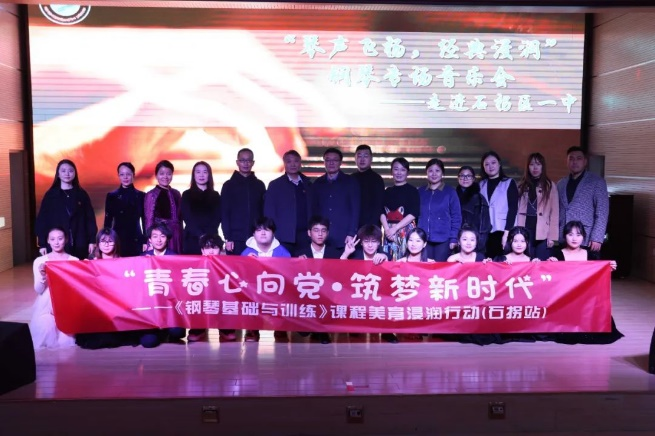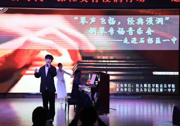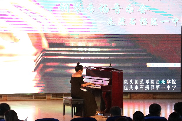11月17日下午音乐学院走进石拐区第一中学,开展“青春心向党 筑梦新时代”——课程美育浸润行动,学院党总支书记赵玉强、教工一支部书记张少宇和钢琴教研室主任郭淑君及部分师生,为石拐区一中师生带来了一场精彩的钢琴专场音乐会。石拐区第一中学校领导、教师和部分学生200多人聆听了音乐会。