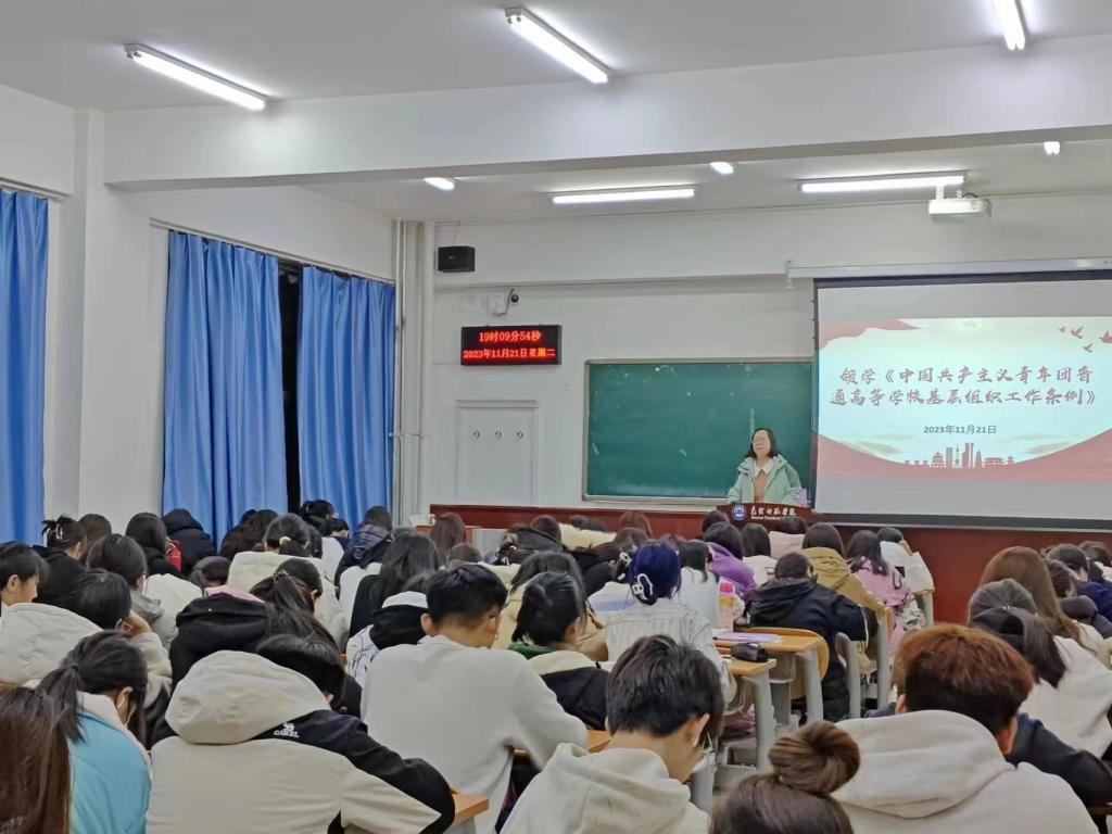 为了深入贯彻习近平新时代中国特色社会主义思想,贯彻落实习近平总书记关于青年工作的重要思想和关于教育的重要论述,加强和改进普通高等学校团的基层建设,近日,共青团中央、教育部联合印发了修订后的《中国共产主义青年团普通高等学校基层组织工作条例》。11月21日晚,教育科学学院举行第五期“青马工程”培训班专题讲座(二)——团课:领学《中国共产主义青年团普通高等学校基层组织工作条例》,此次团课由团总支书记方丽慧领学,全体学员参加。