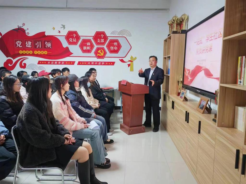 活动伊始,郭宏升介绍了开展此次活动的目的、意义,指出在党员教育方面不仅要发挥教师的教育引导作用,还要发挥学生党员的先锋模范作用。接着由两位优秀学生党员徐嘉蔓同志和许文龙同志为同学们介绍党的章程与二十大精神的相关知识。徐嘉蔓同志从《党章》的修改入手,准确把握《党章》的内容、充分理解《党章》的意义,增进了同学们对党的政治认同、思想认同、理论认同、情感认同。许文龙同志则引领同学们回顾党的二十大精神,聚焦“五大任务”,使同学们深入感悟习近平新时代中国特色社会主义思想的深刻内涵,激励同学们将个人理想、个人规划、个人奋斗与国家的发展紧密联系起来。
