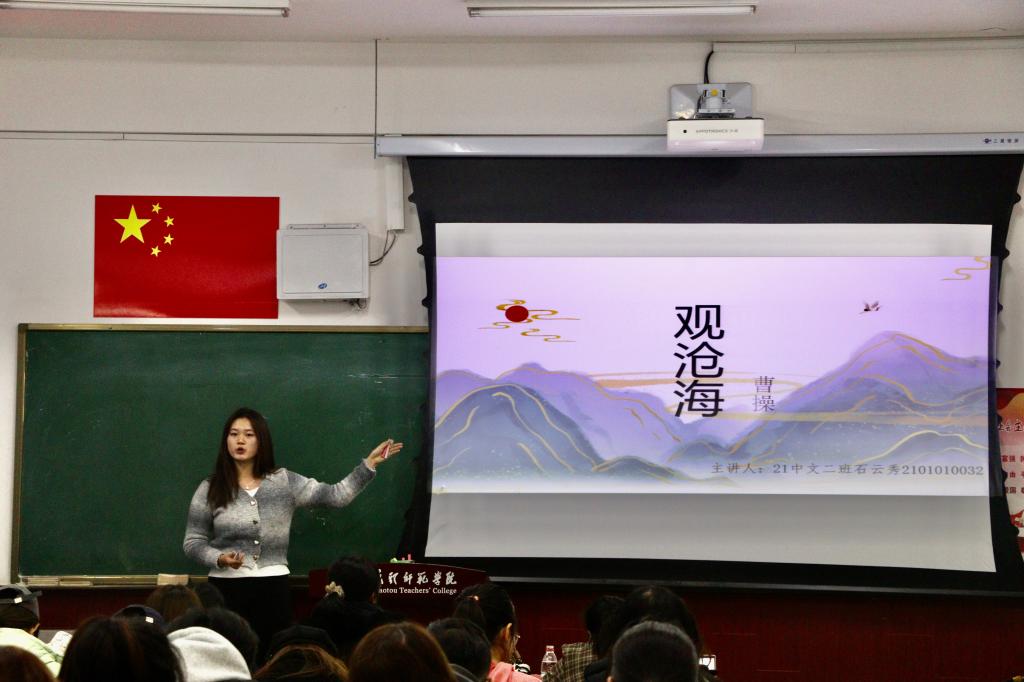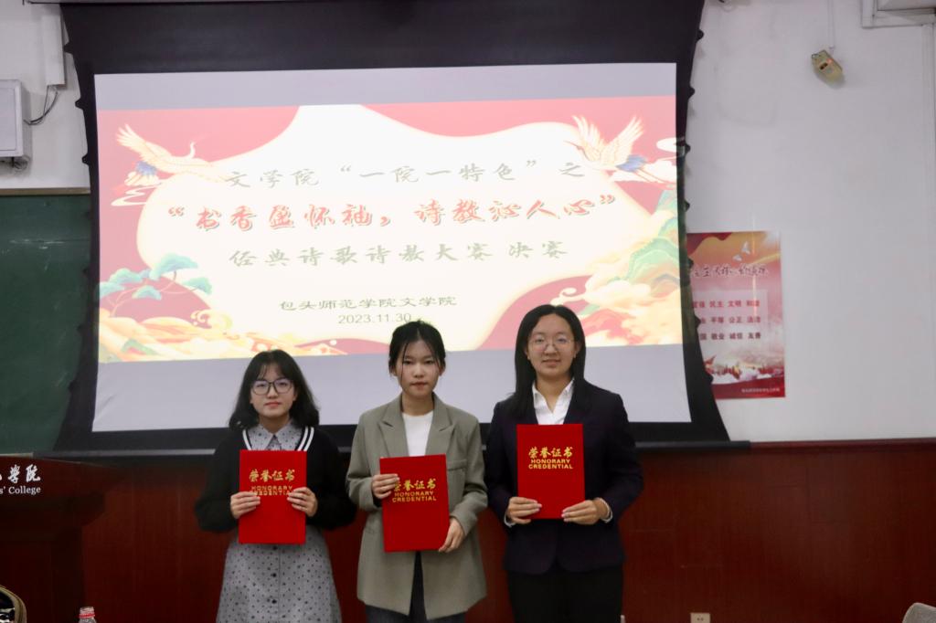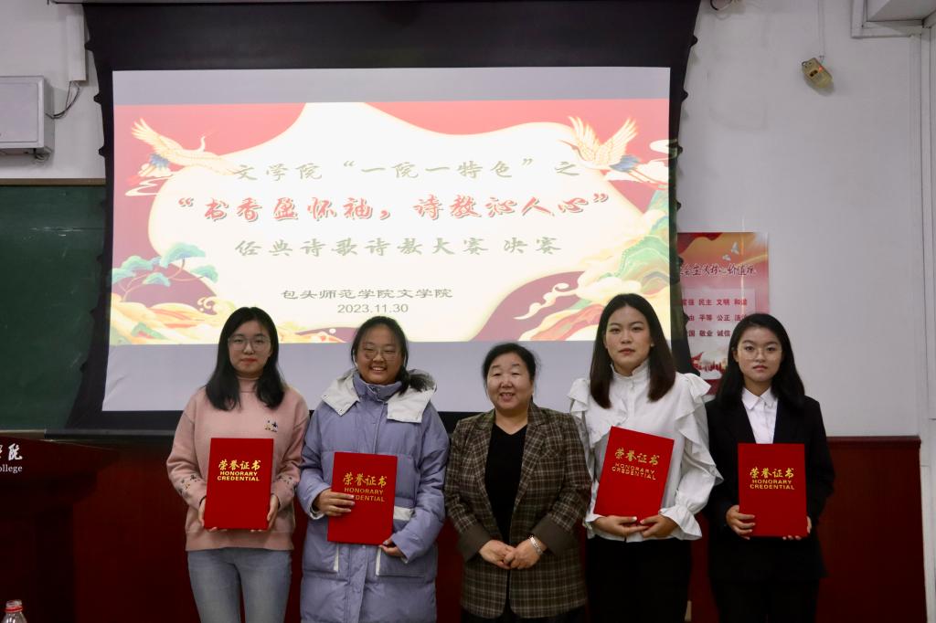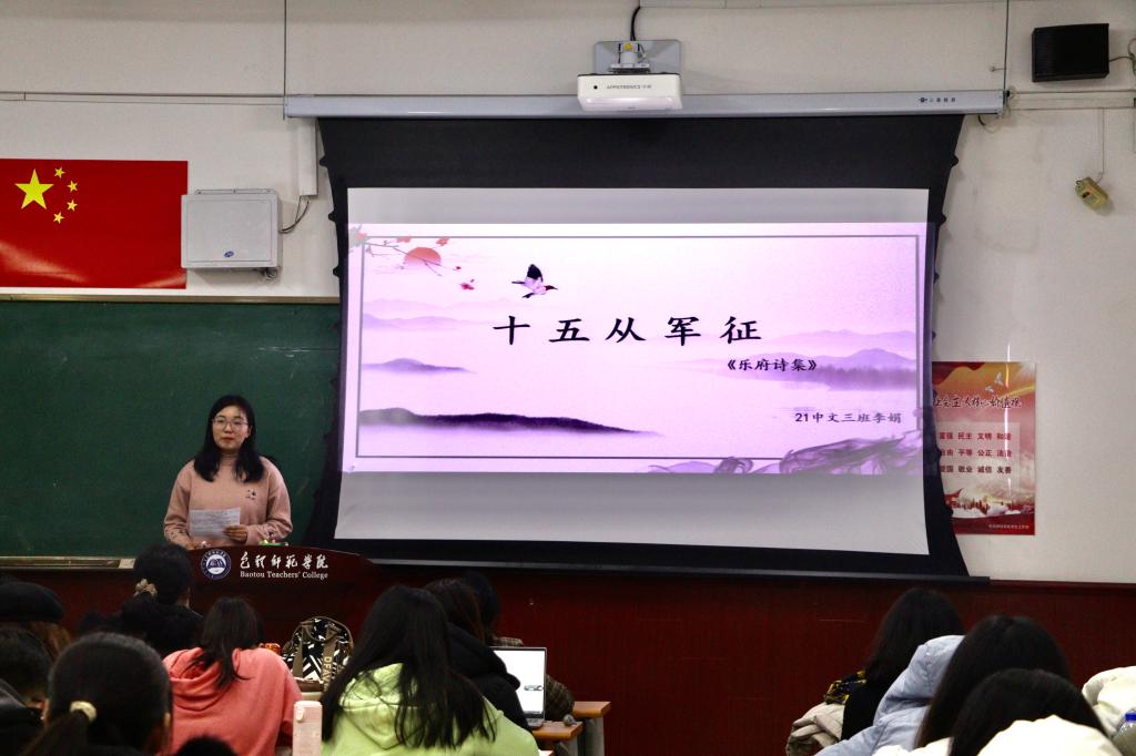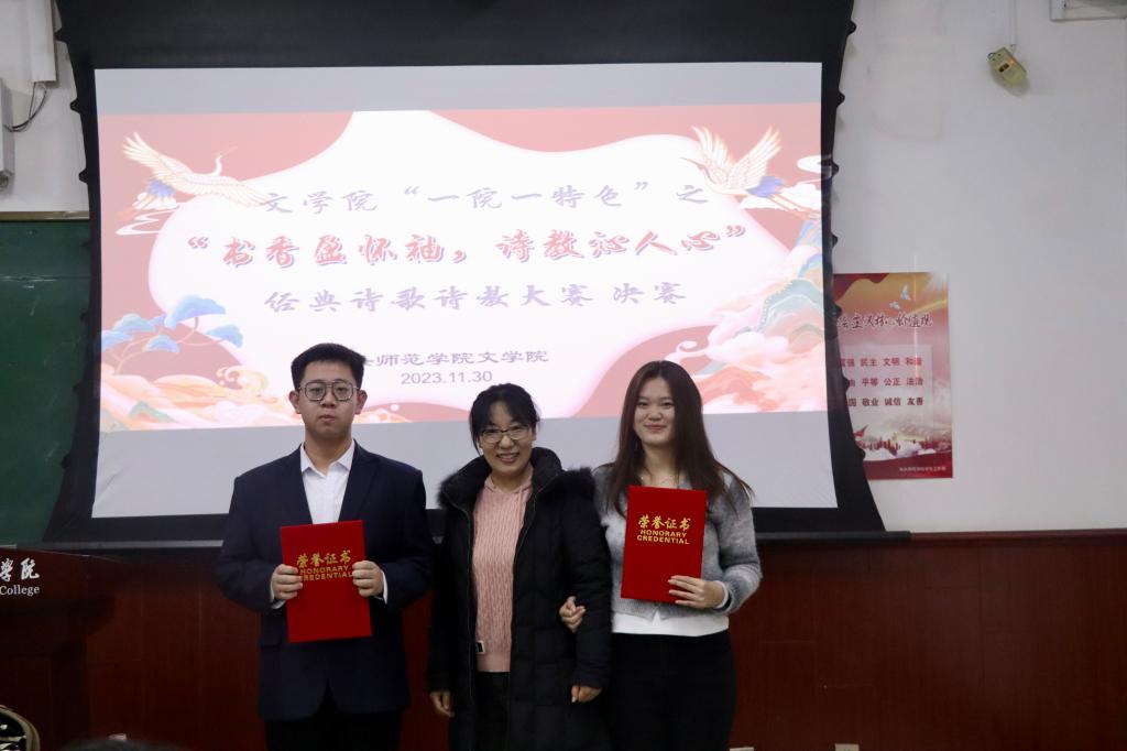 经典如星河闪闪,诗词若溪水潺潺。为弘扬中华优秀传统文化,推动中华经典诗词的阅读与传播,从中华经典中汲取智慧力量。文学院于11月30日下午在博学楼101教室举办“书香盈怀袖,诗教沁人心”诗教大赛决赛。本次比赛初赛全校共报名54名同学,通过初赛的激烈角逐,最终有10位选手成功入围决赛。文学院赵彩娟老师、郁慧娟老师、佟桂芬老师出席本次决赛并担任评委。