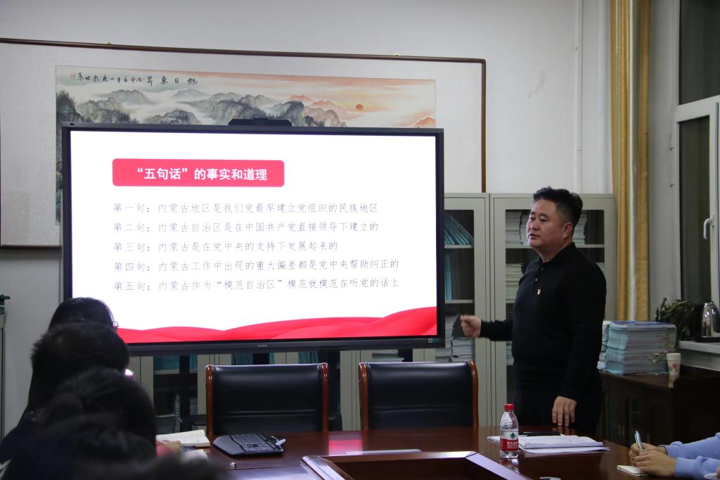 在本次宣讲活动中,刘一峰首先为同学们讲解了“五句话”的事实和道理,其次为同学们讲解了习近平总书记对内蒙古自治区关怀厚爱和期望重托。特别是为内蒙古下达的“五大任务”,对我区精准定位,在产业结构、能源体系和农牧业建设提出了现代化、多元化的要求,旨在扩大我区发展宏伟蓝图,详细讲解了五大任务中各自的具体内容和对应的解决措施。最后,向学生们深入学习领会、全面精准把握《意见》的精神,并要求同学们以强烈的感恩之心和奋进之志抓好《意见》贯彻落实,以进一步统一思想、凝聚力量。