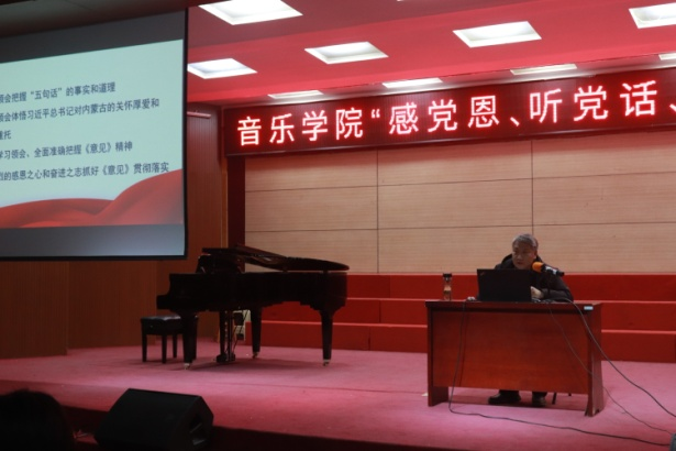 为持续深入学习贯彻习近平总书记对内蒙古的重要指示精神,教育引导音乐学院学生骨干,以强烈的感恩之心和奋进之志贯彻落实好《国务院关于推动内蒙古高质量发展奋力书写中国式现代化新篇章的意见》,12月7日下午学院党总支书记赵玉强在博艺厅开展乐“感党恩、听党话、跟党走”主题宣讲活动。