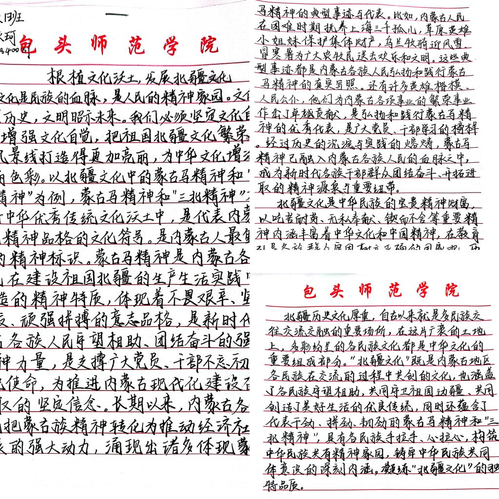 硬笔书法征集活动。11月28日-29日,学院举办了“浓浓豪情拂北疆,悠悠文墨冠古今”硬笔书法作品征集活动。同学们围绕弘扬北疆文化的内涵特征与时代价值、铸牢中华民族共同体意识等内容进行书写,同学们满怀激情,主题鲜明,美观大方,书写规范,一撇一捺皆有力顿挫,笔力雄厚,充分展现了大学生的文化素养。