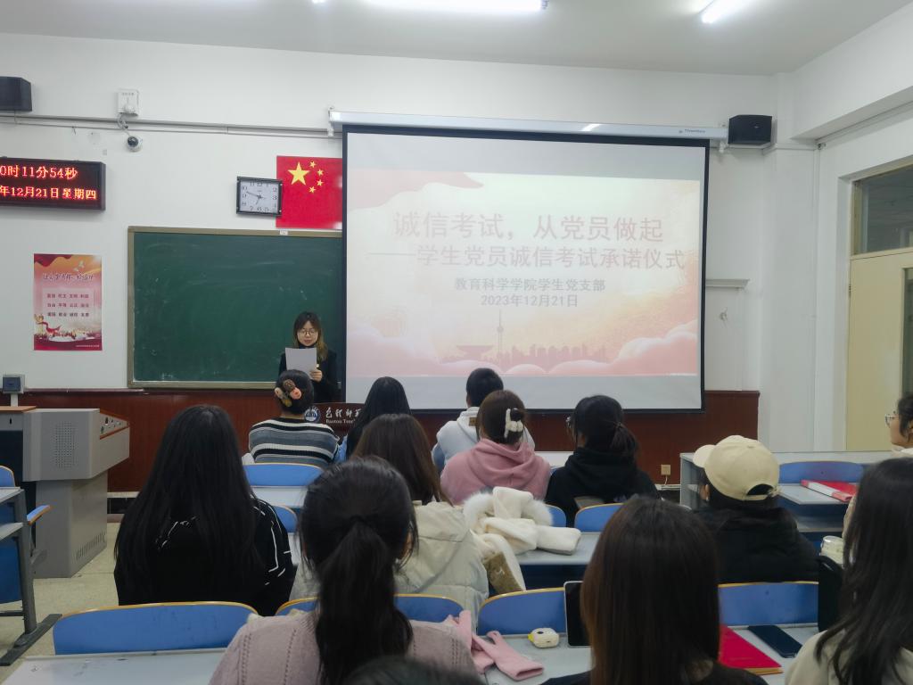 学校期末考试,不仅是检验专业知识掌握情况的考试,更是一场道德品质的考试,直接关系着每位同学诚信处事、以诚待人的品德。为发挥党员先锋模范作用,12月21日晚7点,我院学生支部开展“诚信考试,从党员做起”活动,一支部和二支部党员代表杨悦铭和王跃敏分别领读“戴党徽 亮身份 做表率 诚信应考”倡议书,与会全体学生党员共同签字承诺:考试期间佩戴党徽进入考场,严格遵守考试的规定和守则,自觉接受监考老师和同学的监督。