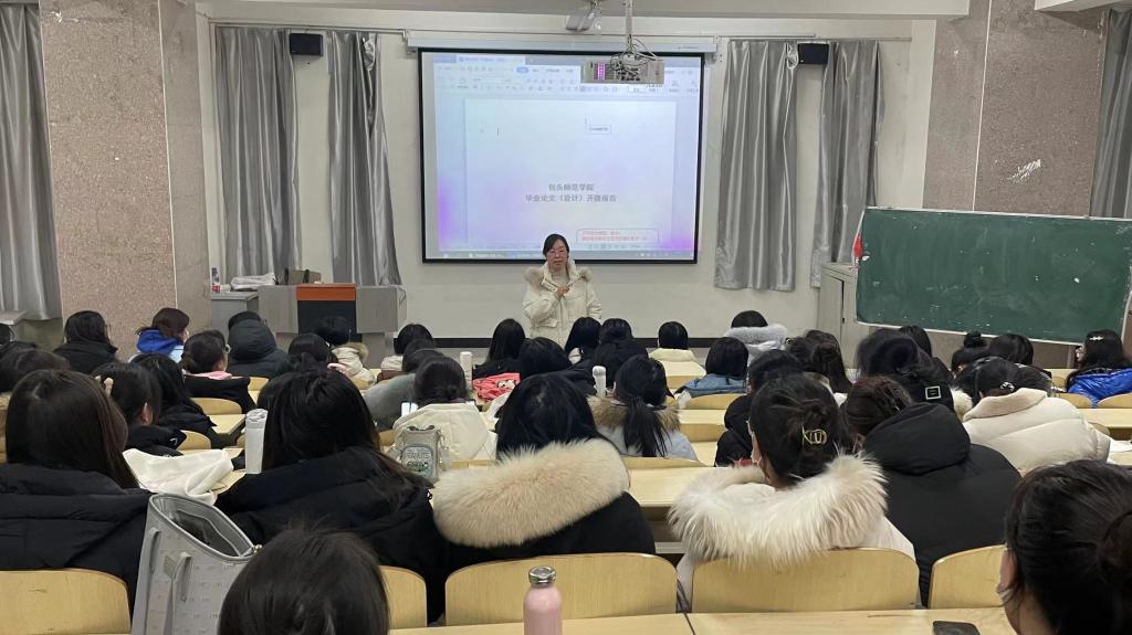 为确保2024届本科毕业论文工作顺利开展,提高毕业生论文撰写水平,规范开题报告的撰写。12月25日,外国语学院开展2024届本科毕业论文开题报告指导专题讲座。外国语学院专任教师张晓敏担任主讲人,2024届全体毕业生参加。