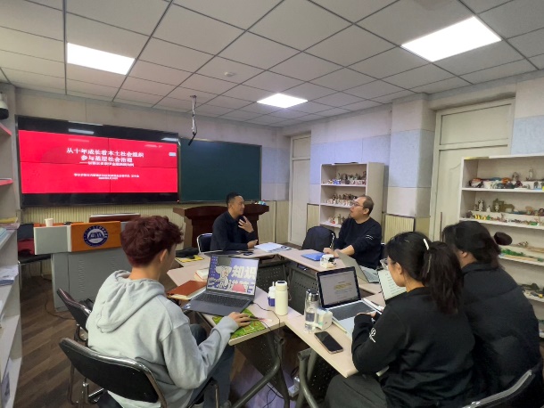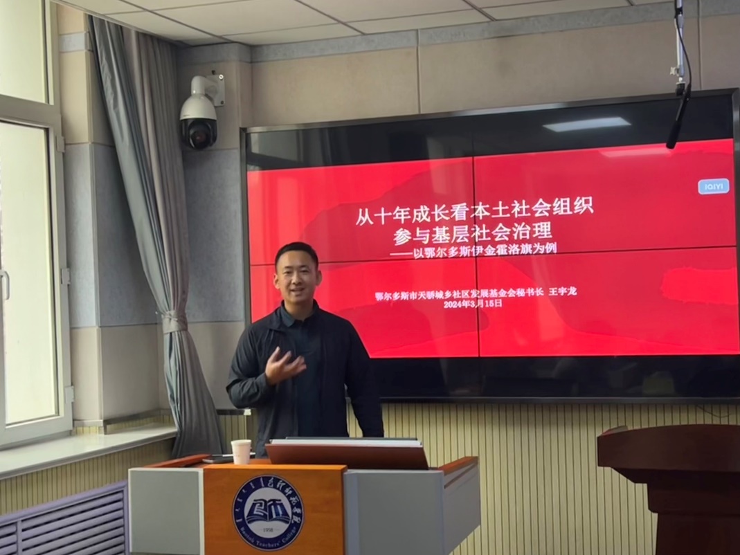 王宇龙秘书长围绕“从十年发展看本土社会组织参与基层社会治理的实践路径——以伊金霍洛旗为例”展开对话主题。从社会组织孵化培育、项目执行流程、项目资金募集、项目案例交流四个部分与23级社会工作硕士和魏成老师进行对话。他提到社会组织运营与项目的开发要依据服务对象切实需求,在满足群体性需求的基础上,创新服务方式,把握社会政策导向,将项目服务做扎实,做群众真正需要的服务。在介绍服务项目资金与项目实施过程时,他与各位同学分享了自己在社会组织管理与项目运营领域的经验心得,以及他所在基金会部分优秀公益项目案例成果,表明优秀的社会组织运营及项目的实施不能局限于单一的实践方式,要从宏观多维的角度思考,培养综合性实践思维。