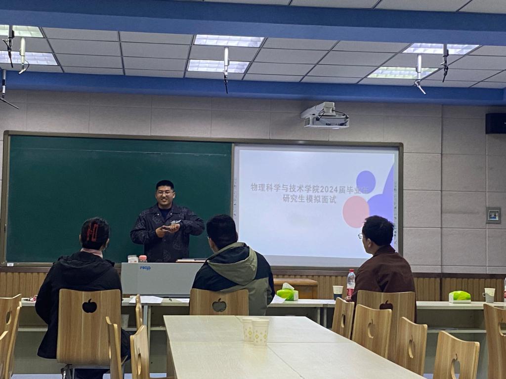 进一步推进考研、就业、择业、职业规划等指导力量深入学生社区,为2024届报考区内外高校研究生初试上线学生,更好地熟悉复试流程,优化面试表现,提升复试竞争力。3月25日晚上,物理科学与技术学院举办研究生复试模拟面试会,邀请王芳院长、徐洋副书记、吴鸿业博士、张铁柱博士、王兴生博士、王莹博士等六位教师担任评委,29名学生分成两组参加模拟面试。