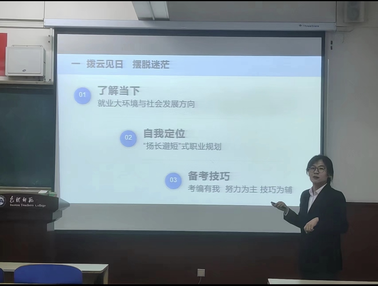 肖老师从“就业形势”、“自我定位”和“备考技巧”三方面分别进行了阐述。首先分析了近年来高校毕业生的就业形势,提出了学生面临的就业问题。其次结合学院专业情况,有针对性的指导学生掌握“扬长避短”式职业规则。随后又详细介绍了每年企业、考录招聘的时间段,并鼓励我院学生认清当前就业形势、在就业季务必做好多线程准备,不要盲目备考。