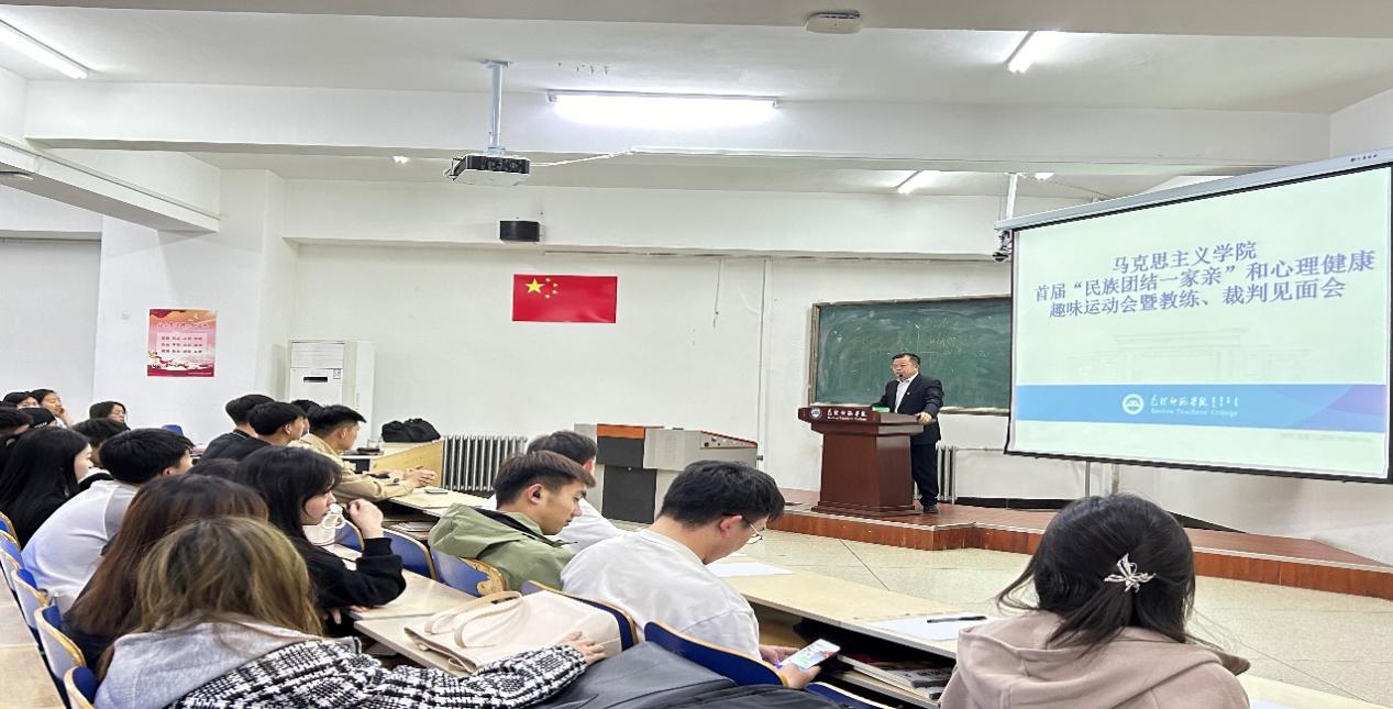 为确保马克思主义学院首届“民族团结一家亲”暨心理健康趣味运动会的顺利举办,2024年4月10日晚上,马克思主义学院在博学楼西606教室召开了马克思主义学院首届“民族团结一家亲”暨心理健康趣味运动会教练、裁判员见面会。学院党总支副书记郭宏升、学工办主任李世光及全体教练员、裁判员、运动员参加了会议。会议由学工办主任李世光主持。