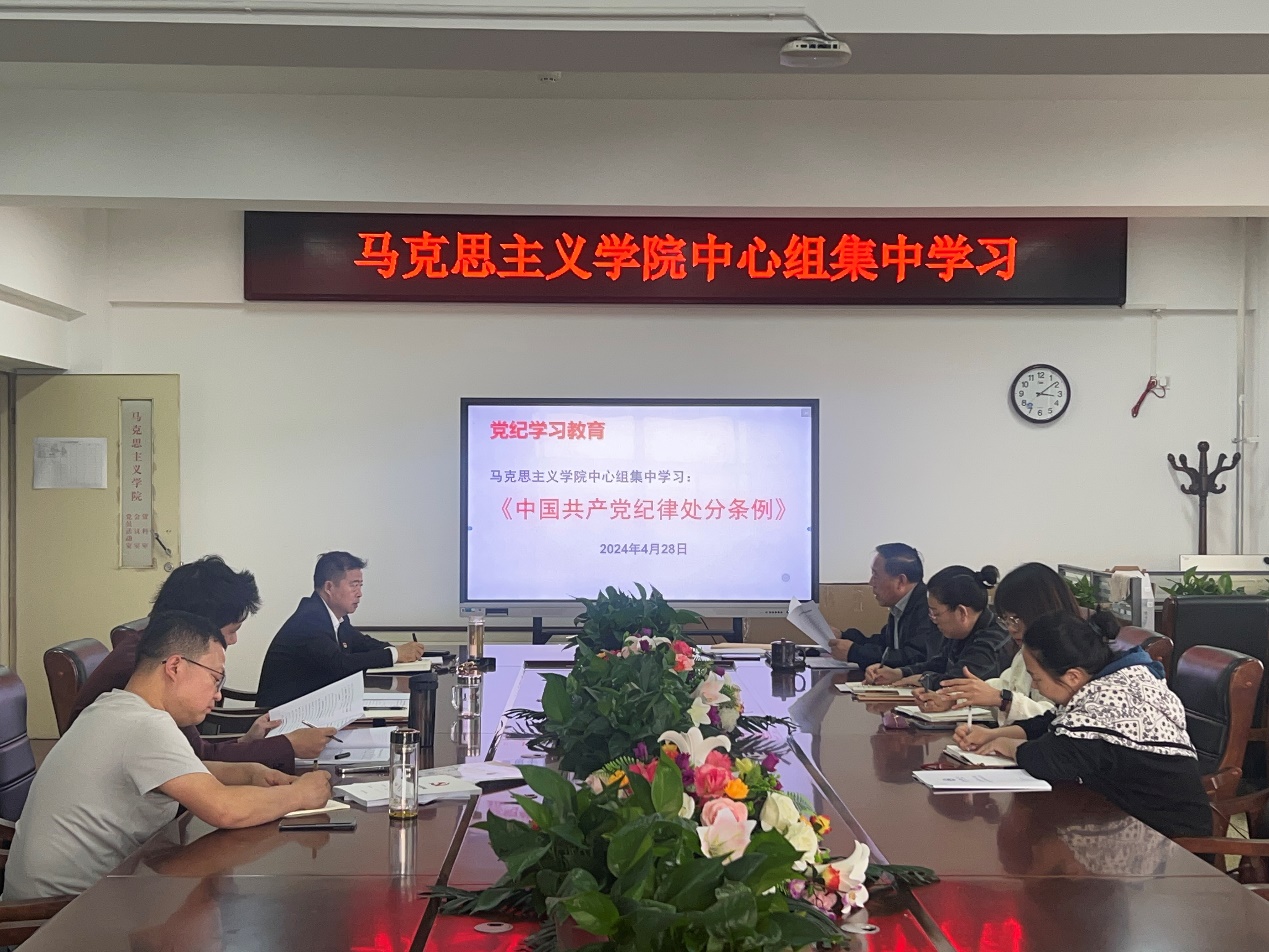 4月28日下午,马克思主义学院中心组开展党纪学习教育集中学习,学院中心组全体成员参加学习,党总支书记胡琮禹主持学习。