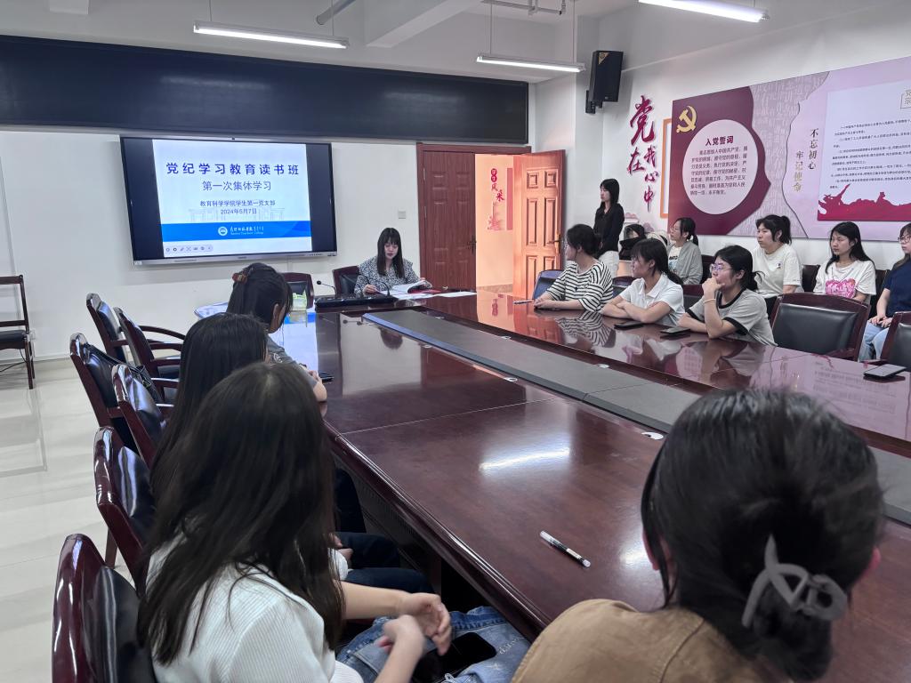 为扎实开展党纪学习教育,深入学习贯彻习近平总书记关于党的自我革命的重要思想,5月7日晚,教育科学学院学生第一党支部党纪学习教育读书班开展第一次集体学习,会议由支部书记王璐然主持,30名学生党员参加会议。