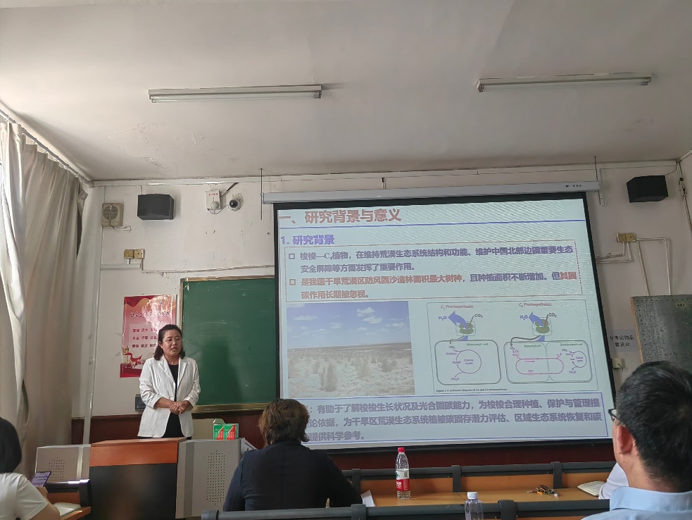 贺晓慧老师的讲座以“典型荒漠植物梭梭(Haloxylon ammodendron)叶绿素含量及光合固碳能力研究”为题,概括介绍了该项目的研究背景和意义、研究概况及研究方法,详细讲解了梭梭叶绿素含量时空变化及影响机制、梭梭光合生理特性及固碳释氧能力、梭梭叶绿素含量与光合固碳潜力的关系、以及所在团队对梭梭开展的一些其他研究。