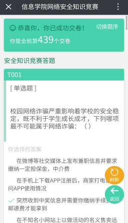 通过参加本次大学生网络安全知识竞赛,有利于促进我院学生深入贯彻落实习近平总书记系列重要讲话精神和网络强国战略思想,激励学生学习宣传网络安全知识,不断提升网络安全防护技能,对学生树立正确的网络安全观具有很重要的现实意义。(信息科学与技术学院)