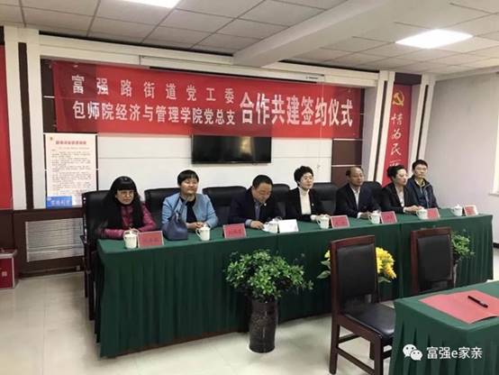 11月10日下午,双方在富强路街道办事处举行了签约仪式,富强路街道党工委书记、办事处主任高竹,副书记周炜,办事处副主任王莹及所属社区的党支部书记,经管学院党总支书记高日晨、教工党支部书记张立颖、人力资源管理系主任袁家志、公共事业管理系主任刘瑞清,以及人力资源管理专业、公共事业管理专业2014级25名学生参加了签约仪式。