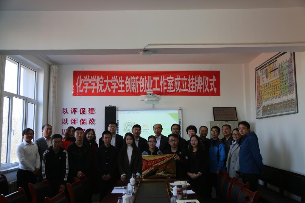 11月3日,化学学院举行学生创新创业工作室挂牌仪式,校党委副书记、院长刘兴旺、创业教育学院院长张东虎、化学学院领导史继敏、魏兵、冯丽以及学生创新创业工作室指导教师和学生参加了仪式。