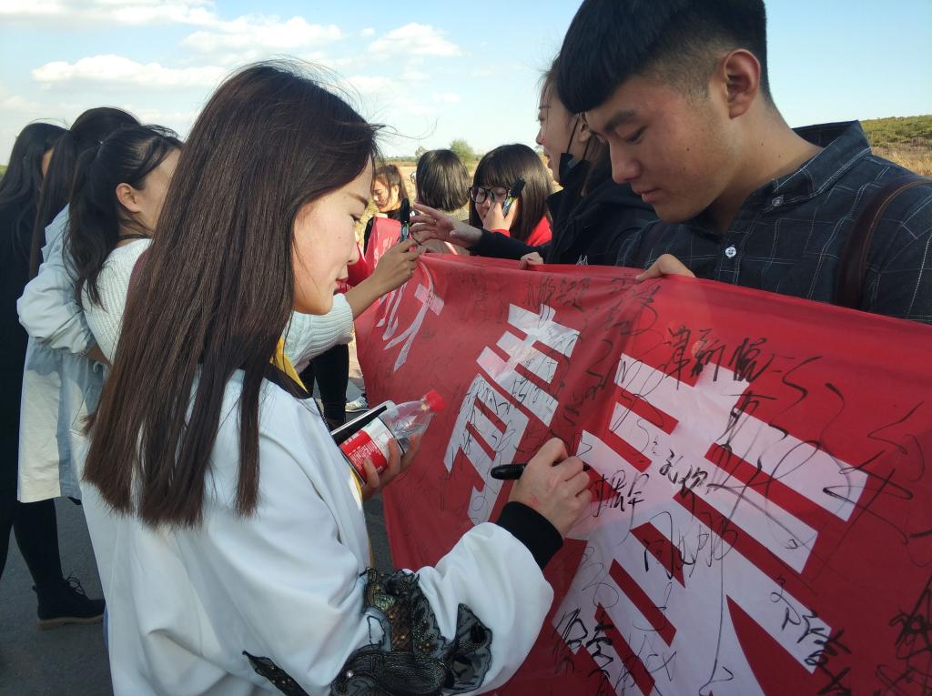 此次活动由12位佩戴社会主义核心价值观标识的团小组组长带领,通过“花海寻宝”——寻找团徽的活动来确定各团小组出发的顺序,每位同学脸上都粘贴有小红旗,体现了本次活动“喜迎十九大”的主题。活动中,师生们积极参与,精神饱满,一起行走,一边交谈,并在活动终点的横幅上留下了自己的签名。