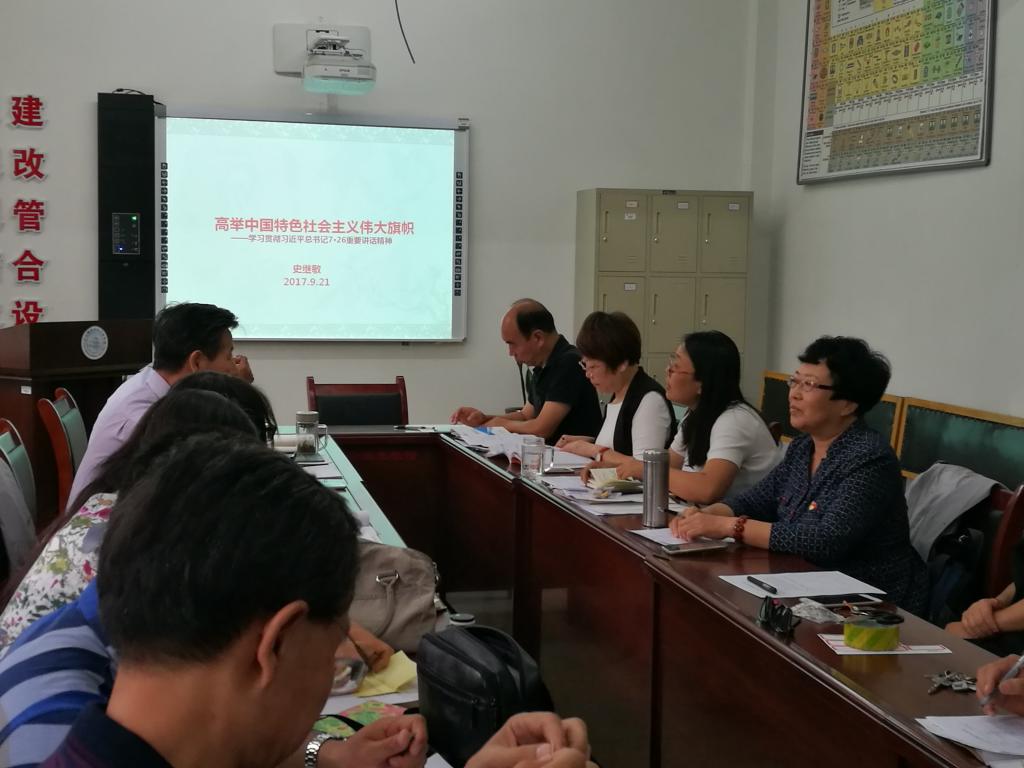 9月21日下午,化学学院教工党支部召开了全体党员大会,会上,党总支书记史继敏通过PPT以“坚持和发展中国特色社会主义”为题,为教工党员解读了习近平总书记7.26讲话;党支部书记高俊芳就党支部三项制度和党员履责践诺事宜作了说明,支部委员王连连带领全体党员重温了《党章》中党员的权利和义务;党员教师庄重地佩戴了党徽,并在履责践诺事项上进行了签字,从基础项和先锋项两个方面认领了目标任务。